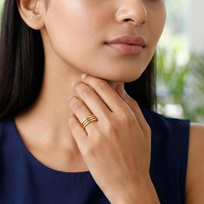 This gold plated ring for women features an interlocking multi-band silhouette, held together by vertical bridge conn...