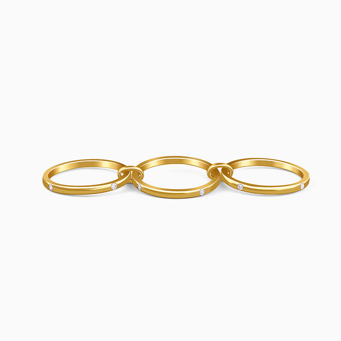 This gold plated ring for women features an interlocking multi-band silhouette, held together by vertical bridge connectors. Its minimalist design is elevated with flush-set zircon accents, blending architectural structure with timeless appeal.