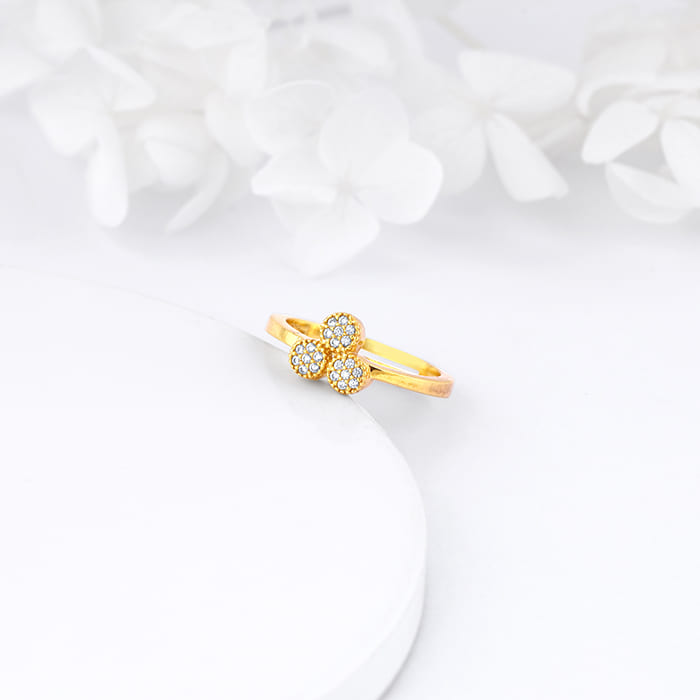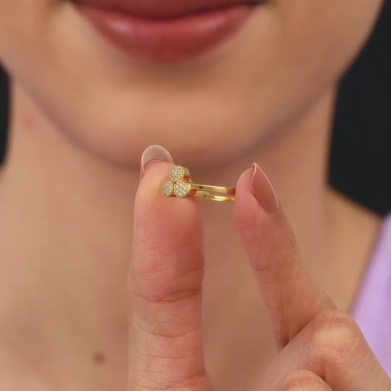 This golden ring features three circle motifs studded with zircons forming a triangle shape.