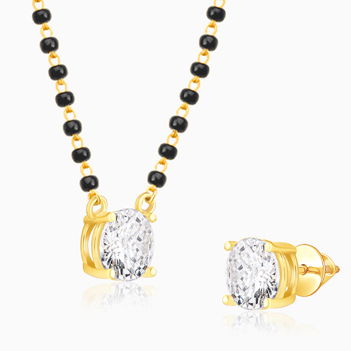 This gold-plated set has a mangalsutra and a pair of earrings, which has a big single-stone zircon placed at the centre with a black beaded chain. And earrings in sparkling zircon feature the most gorgeous sparkling crystal, set in a square of golden.