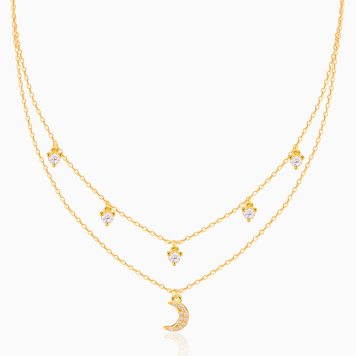 This golden necklace is double-layered and has crescent moon motifs set with zircons.