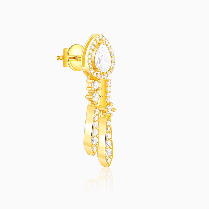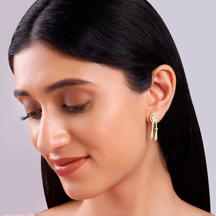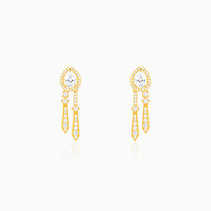 Sometimes all you need is one piece to pull everything together, and these gold plated earrings for women are exactly that. It features a pair of pear-cut zircons set in halos with smaller zircons, which transition into two vertical strands cascading below.