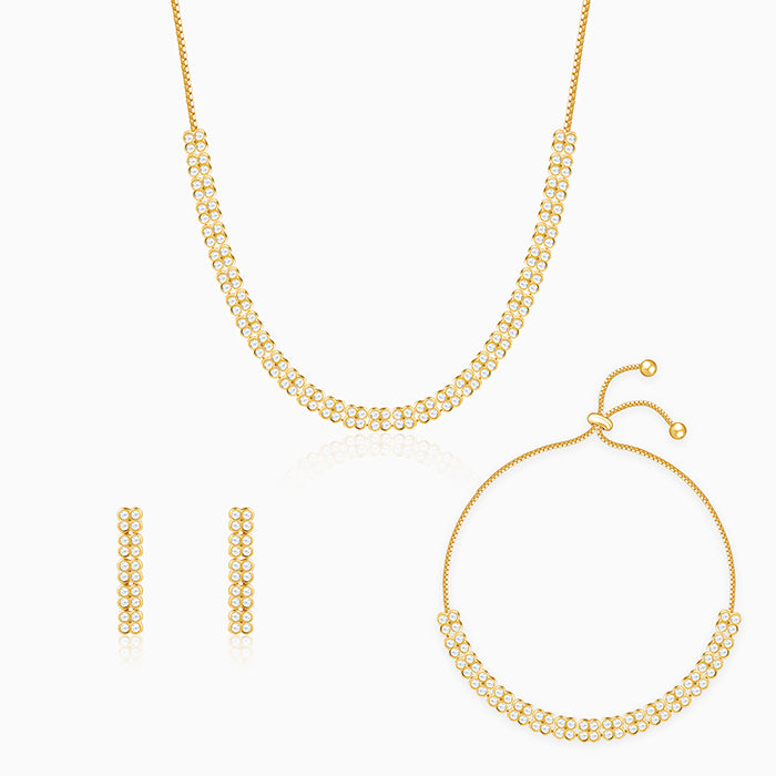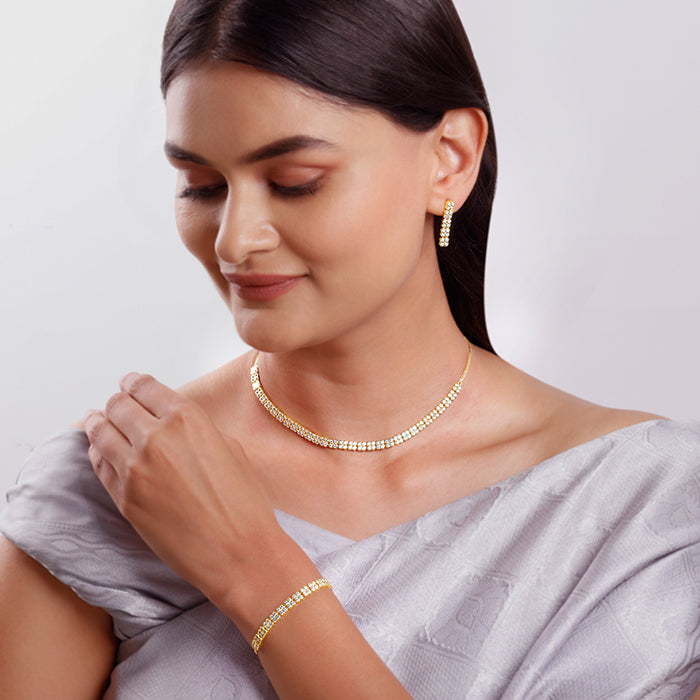 This gold plated set includes a necklace, a bracelet and matching studs for women. The set features floral designs. Each flower is beautifully studded with sparkling zircons. Presenting our DIVA Collection - a limited edition silver jewellery meant for the women who own every room. Be the star of the party, always.
