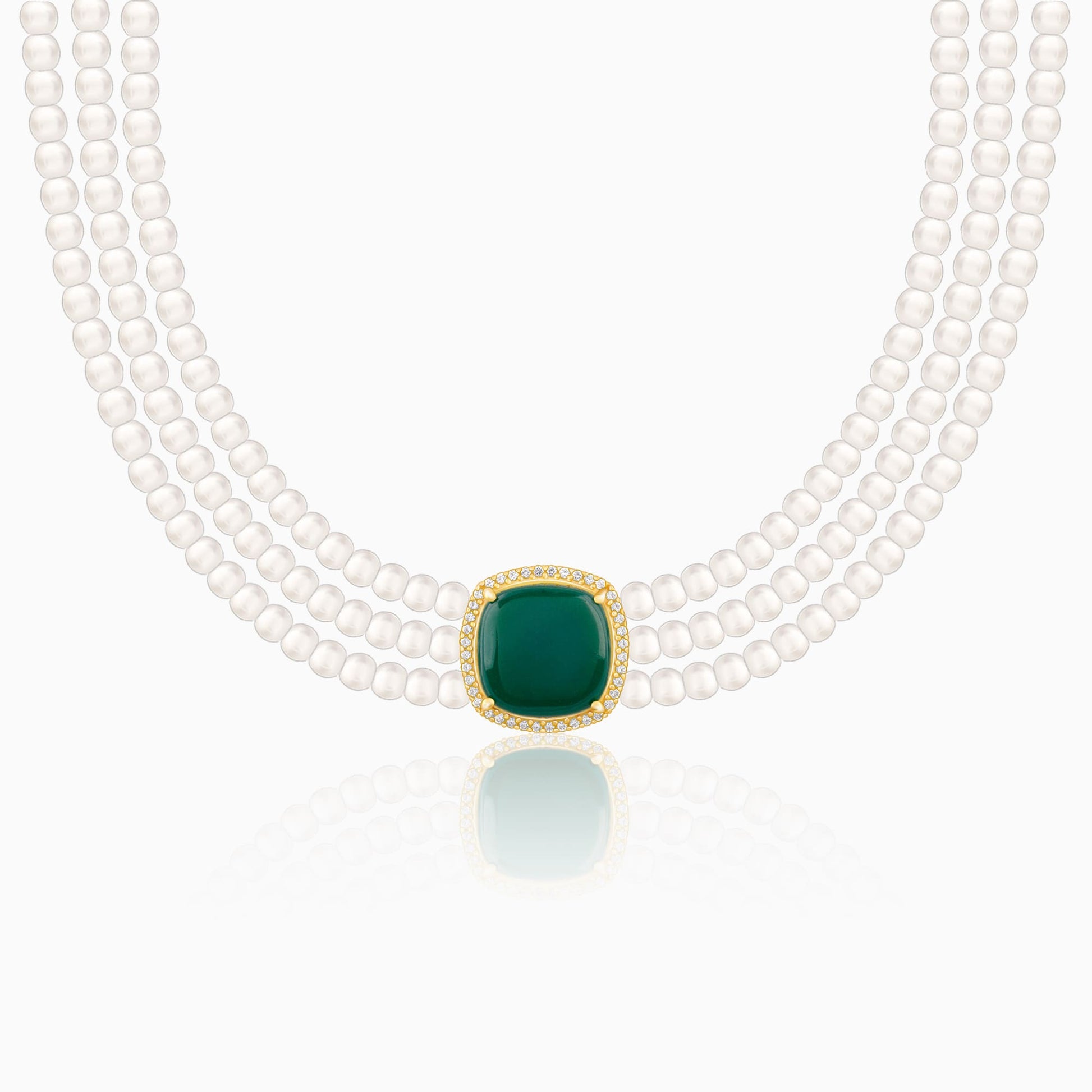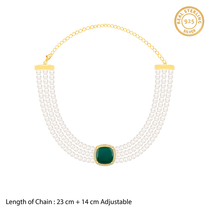 This golden choker necklace features a rounded square green coloured stone, nestled with zircons. This is attached to three pearl layers.