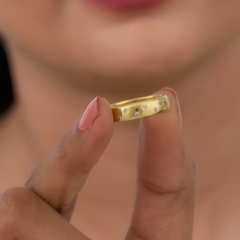 This gold plated ring for women showcases evenly placed, flush-set zircons.