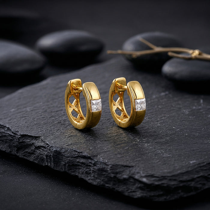 Simple in shape yet powerful in presence, these gold plated hoop earrings for men feature a single flush-set zircon at the centre. The design is elevated by geometric latticework along the inner gallery, adding structural detail and a sharp, modern edge.