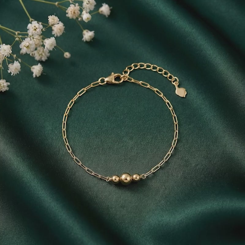 Own your edge with a design that strikes the perfect balance between raw strength and refined style. This golden bracelet centres on a bold triple-ball motif anchored by an elongated link chain, creating a high-impact silhouette for the woman who defines her own rules.
