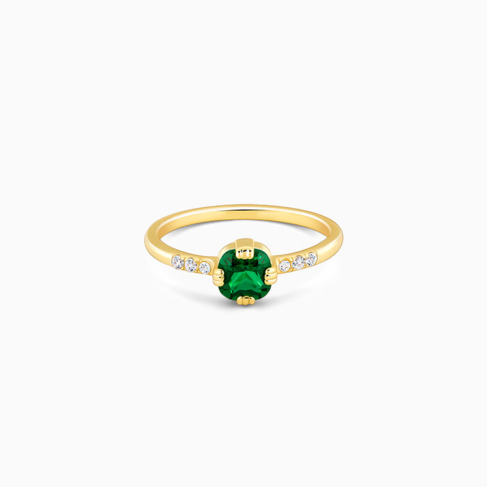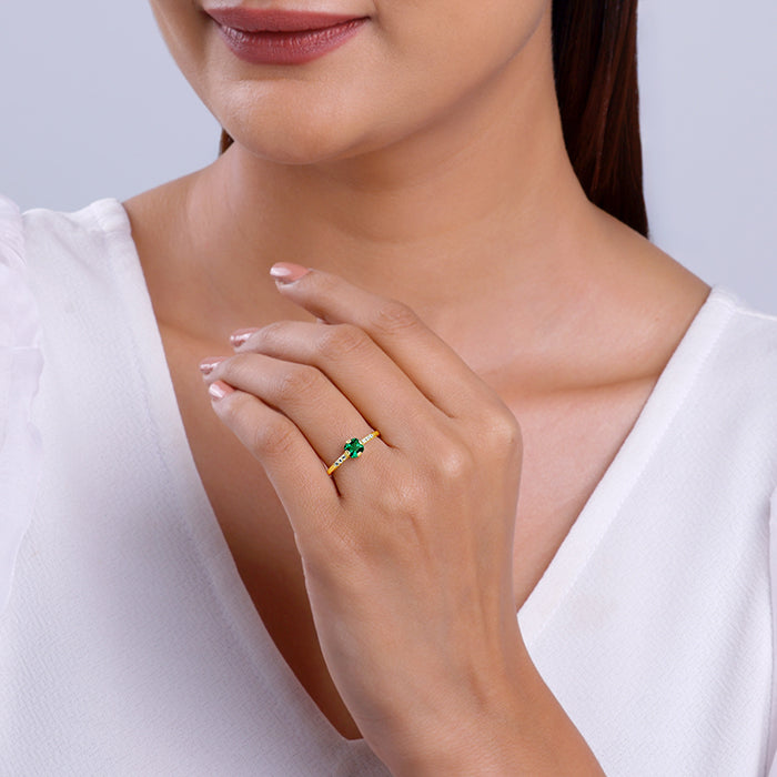 This golden ring showcases a central emerald-cut square motif, flanked by three sparkling zircon stones on each side of the band.
