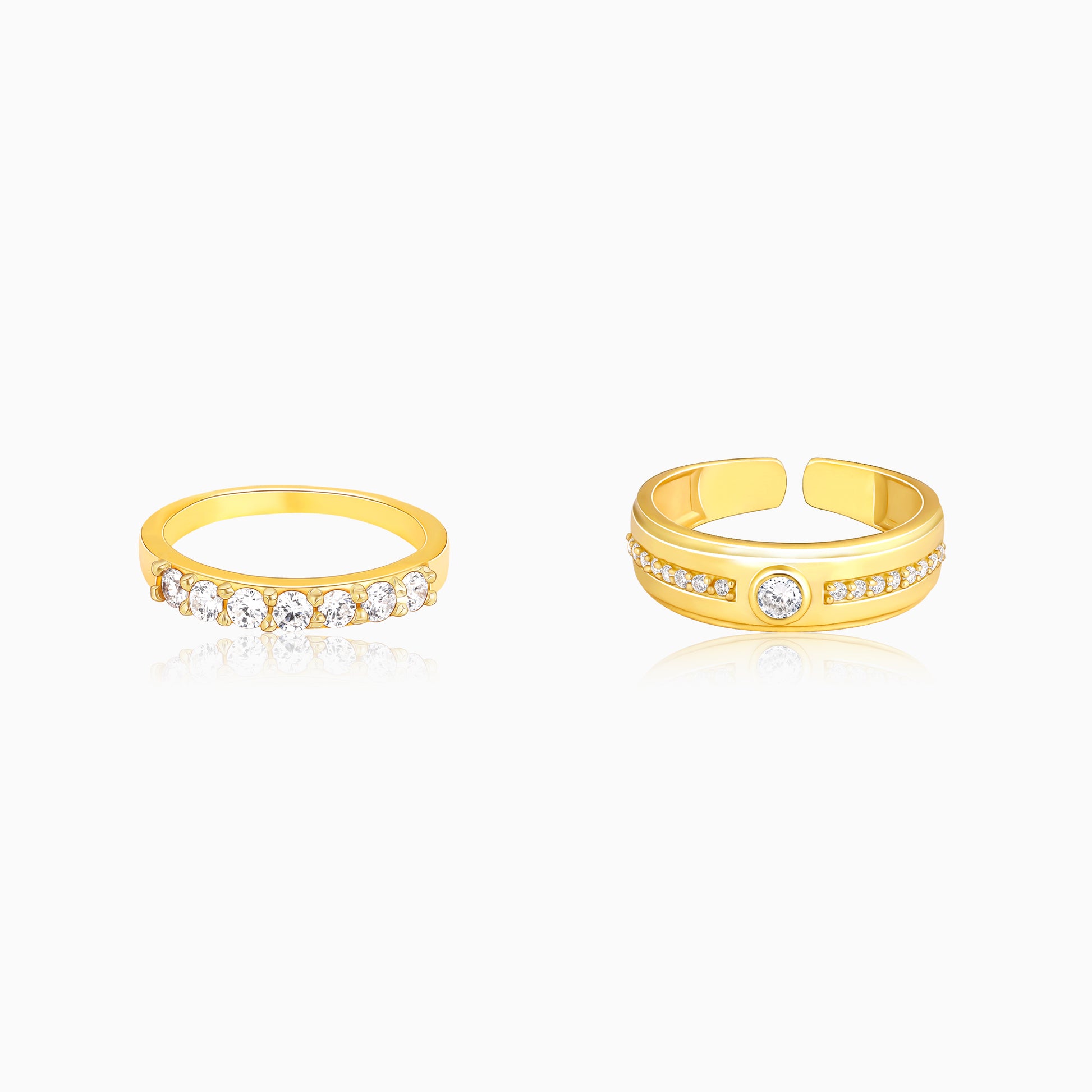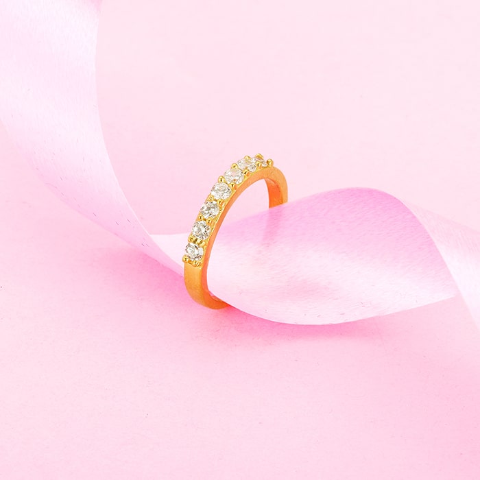 The Women's ring has zircons studded on the golden rim. The Men's ring has a zircon placed at the centre with embellished lines on the band.