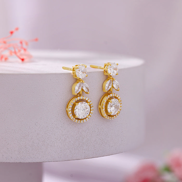 For the woman whose style is effortlessly graceful, these silver dangling earrings adorned with delicate leaves and circles studded with zircons become her signature sparkle. Each movement catches the light, reflecting elegance and a timeless charm that complements any outfit.