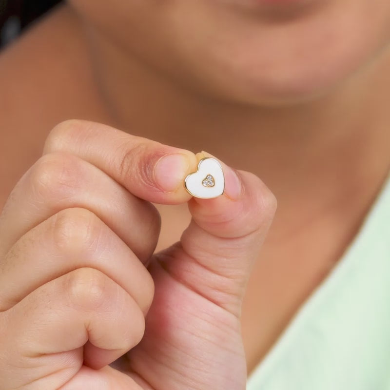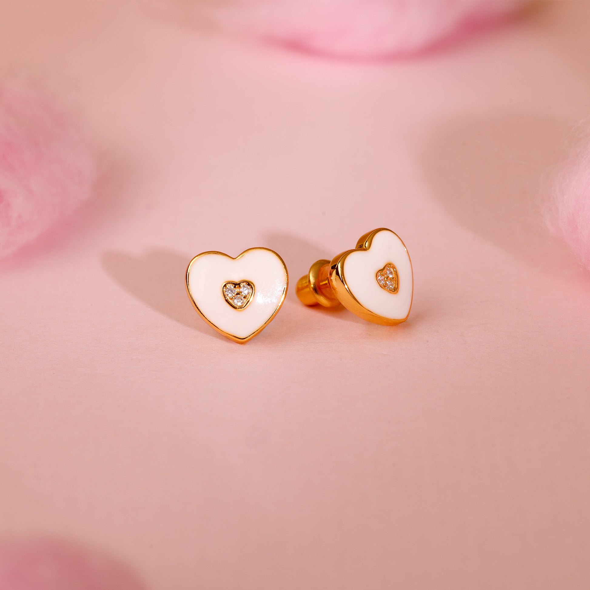 These gold plated studs for kids feature a heart motif. The heart is coated with white enamel and studded with zircons at the centre.