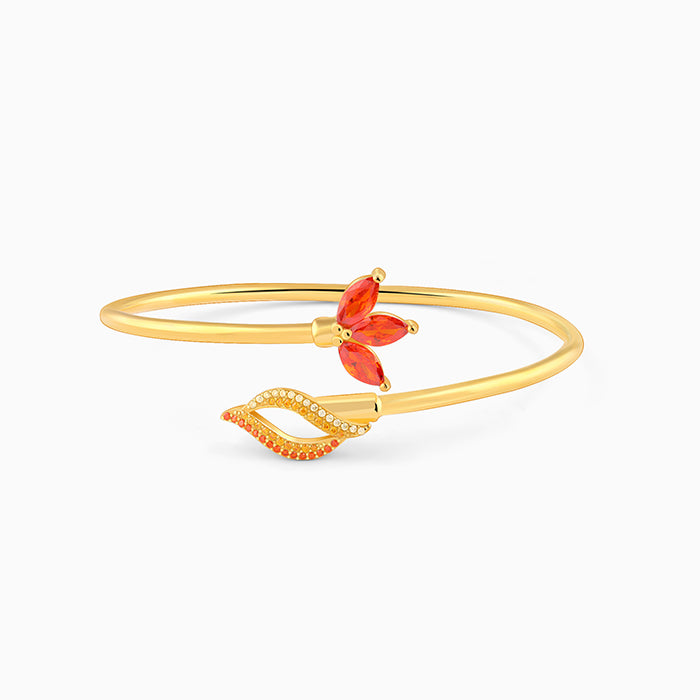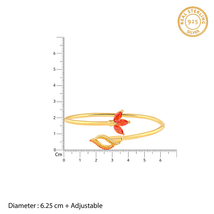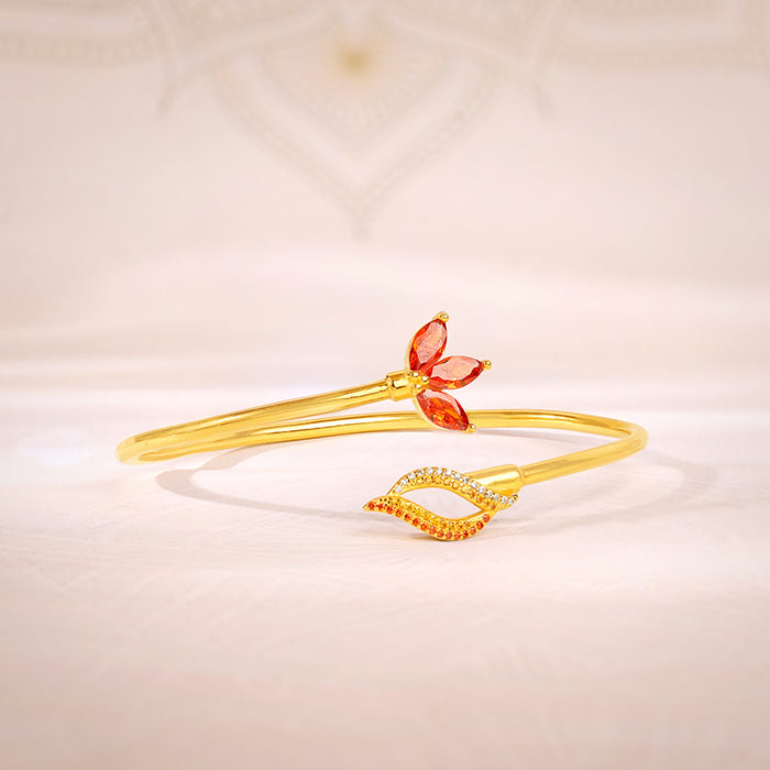 This gold plated cuff bracelet for women has an adjustable design. One edge features a flower studded with colourful zircons. The other edge showcases a leaf motif, also set with colourful zircons. Designed in Italy. Inspired by India. Embrace the goddess within with the Shakti Collection by GIVA x Anna Giulia Chicco.
