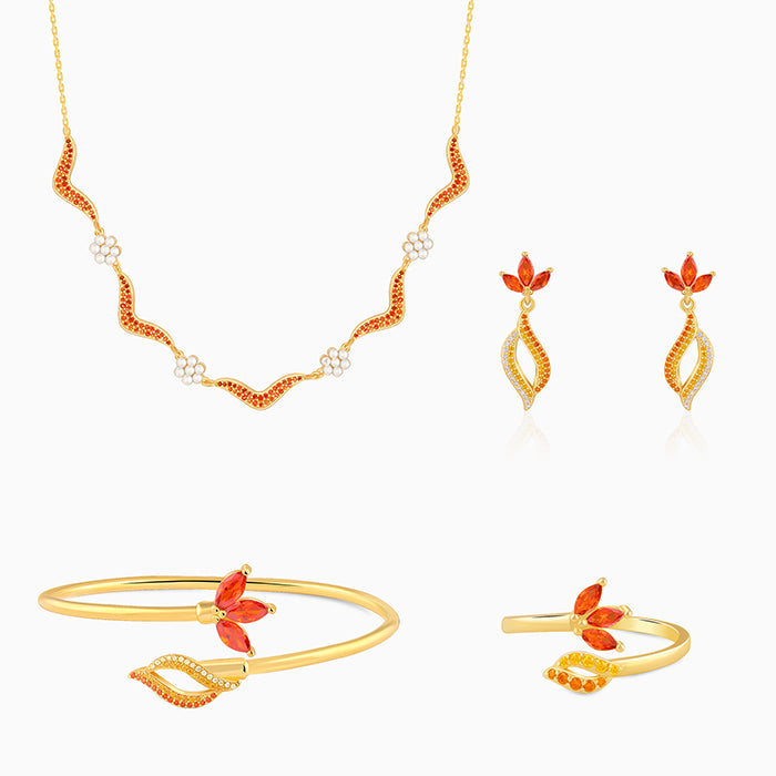 This gold plated set for women includes a necklace, ring, cuff bracelet and matching earrings. The necklace features a wavy design with floral motifs placed alternately. The waves are studded with colourful zircons, while the flowers are set with pearls. The earrings showcase a flower motif with colourful zircons and a leaf-shaped design accented with zircons below. The open-design ring and bracelet complete the set, each featuring a zircon-studded flower on one edge and a leaf motif on the other. Designed in Italy. Inspired by India. Embrace the goddess within with the Shakti Collection by GIVA x Anna Giulia Chicco.