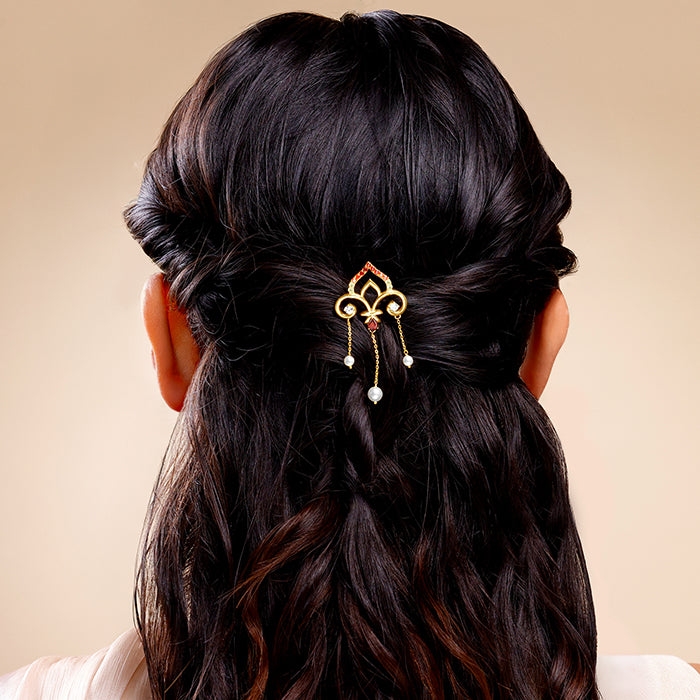 This gold plated hair pin for women features a decorative top with a mix of colourful zircons and zircons. Two scrolled designs hang from the top, each with a zircon and a dangling pearl. A central chain with a coloured stone and a larger pearl hangs from the middle. Designed in Italy. Inspired by India. Embrace the goddess within with the Shakti Collection by GIVA x Anna Giulia Chicco.