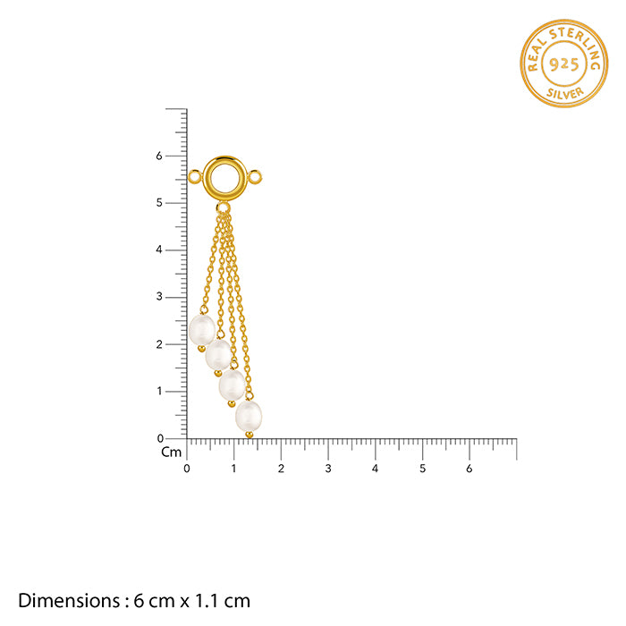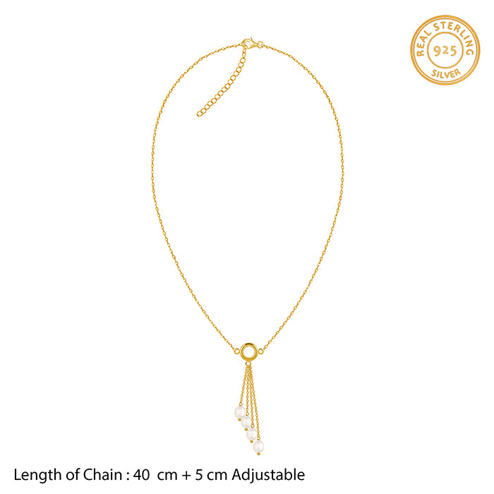 This elegant gold plated necklace features a central polished ring suspended from a refined chain. Four tiered drops descend from the focal point, each finished with a lustrous white pearl. An ode to timeless beauty, our freshwater 'Pearl Collection' is designed to complement every woman with refined, classic elegance.