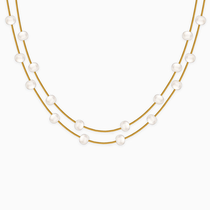 Easy to style and impossible to ignore, this dual-layered gold plated necklace with spaced pearls brings a modern twist to a timeless favourite.