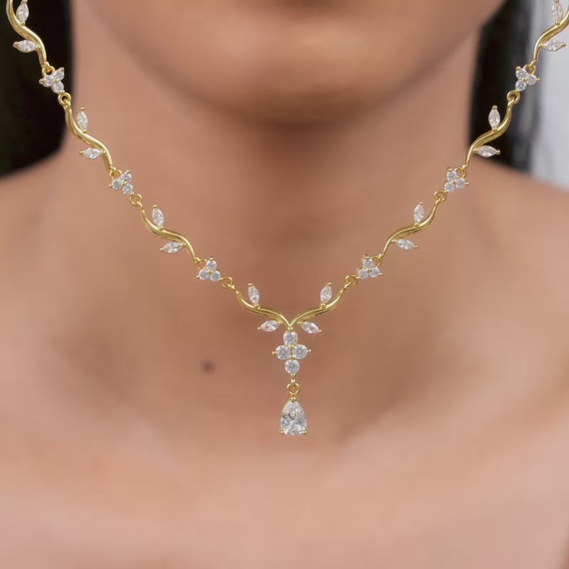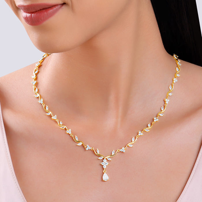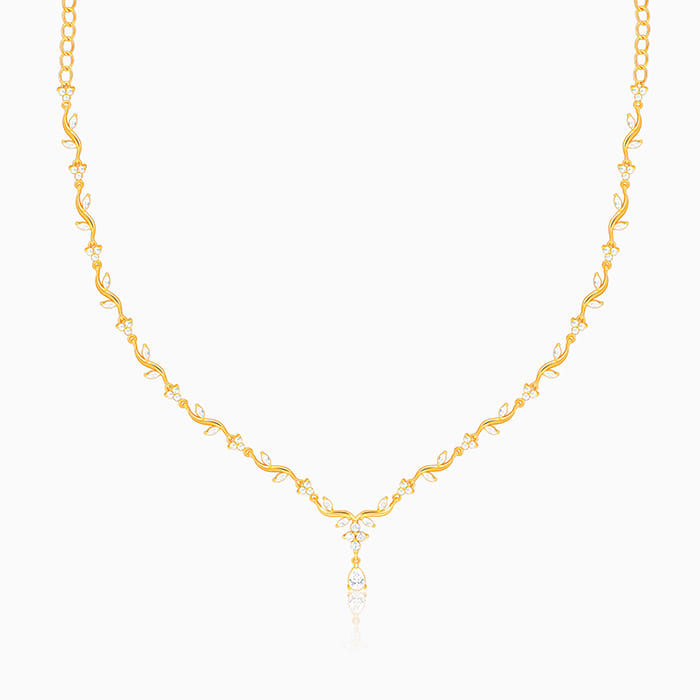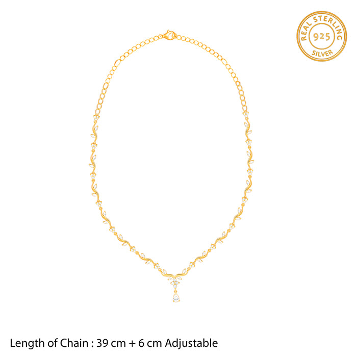 This gold plated necklace for women features a vine-inspired chain with alternating zircon-studded leaves and flowers. At the centre, a teardrop-shaped zircon dangles beautifully. Presenting our DIVA Collection - a limited edition silver jewellery meant for the women who own every room. Be the star of the party, always.
