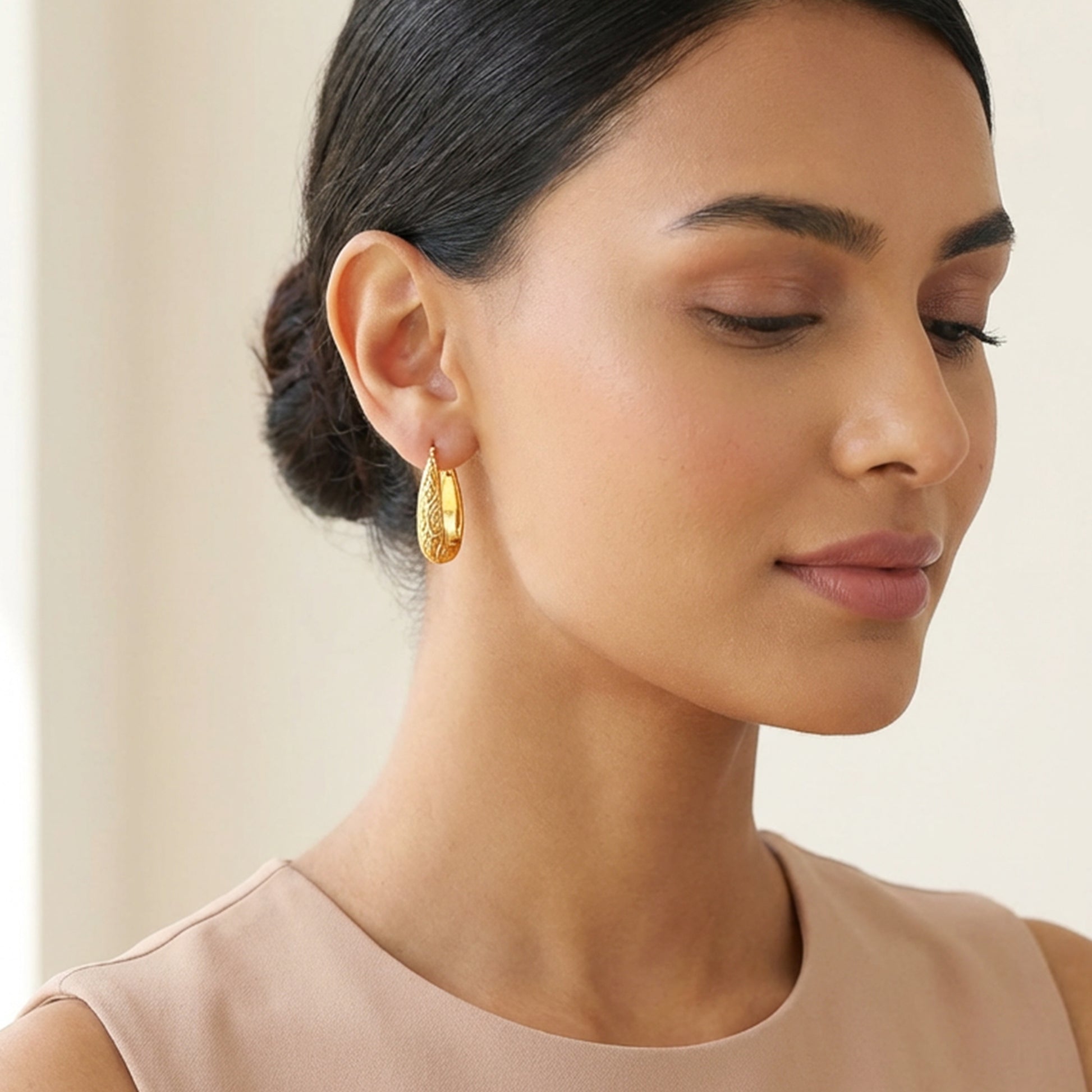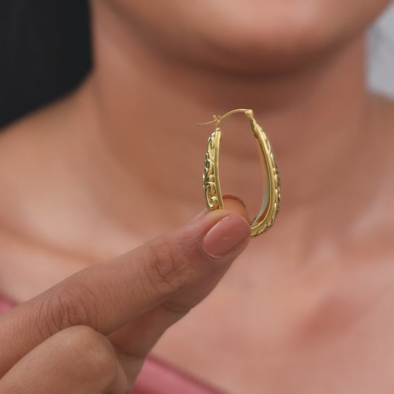 Inspired by intricate patterns, these Moroccan-style gold hoops feature detailed embossed work that adds depth and texture. Statement-making yet refined, they're perfect for elevating both everyday and occasion looks.