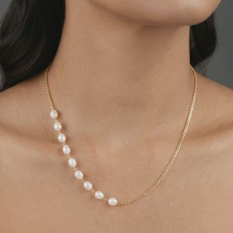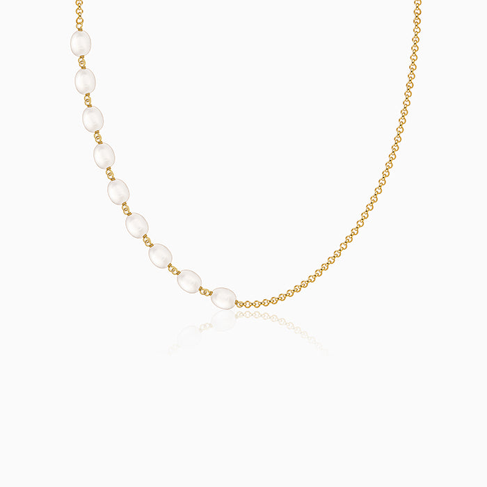 This elegant gold necklace features a sequence of luminous freshwater pearls. Each pearl showcases a unique shape and a soft, iridescent glow. The minimalist design is finished with an adjustable lobster clasp, offering a versatile length. An ode to timeless beauty, our freshwater 'Pearl Collection' is designed to complement every woman with refined, classic elegance.