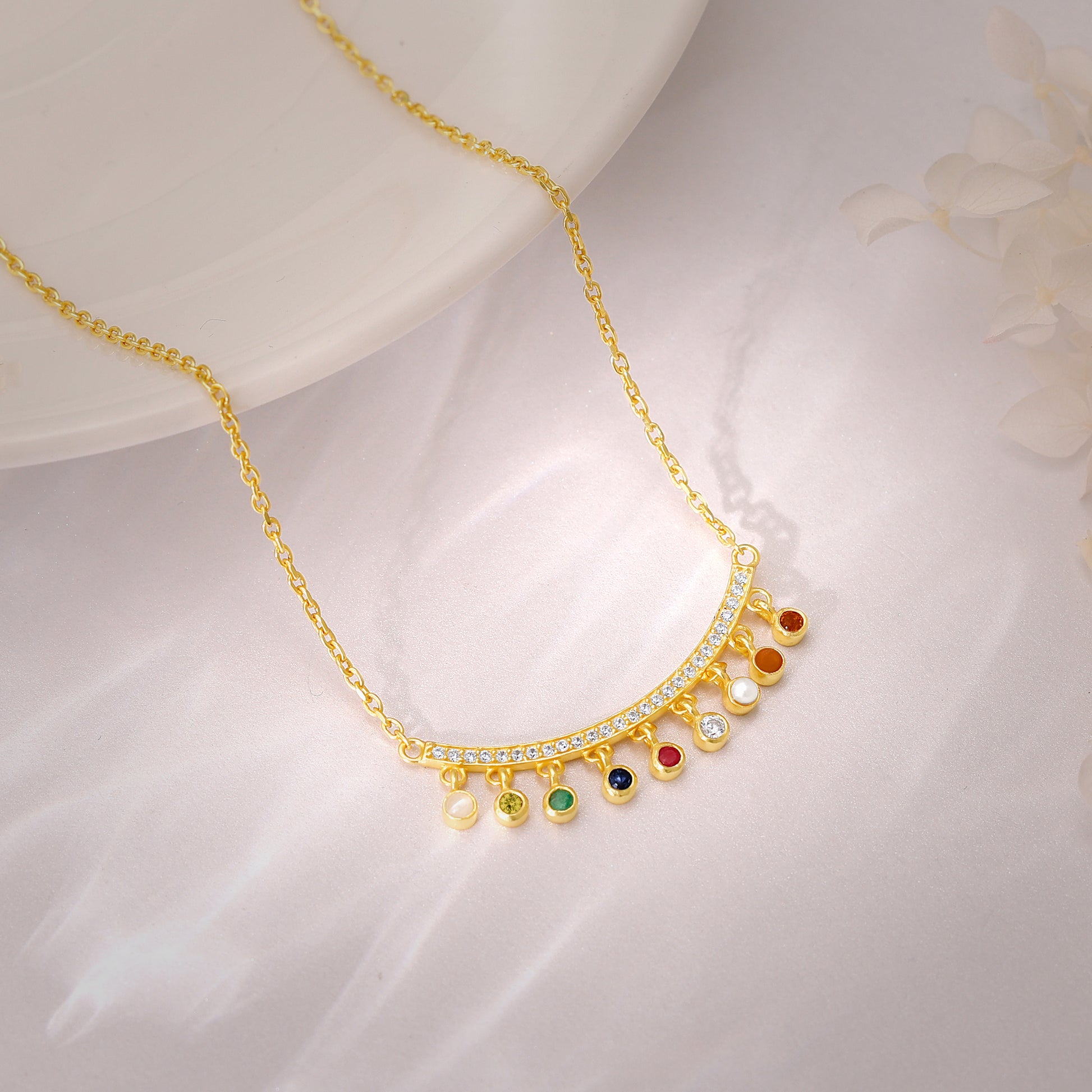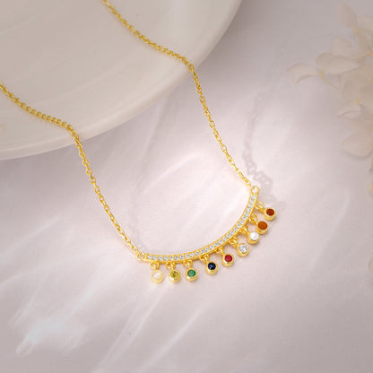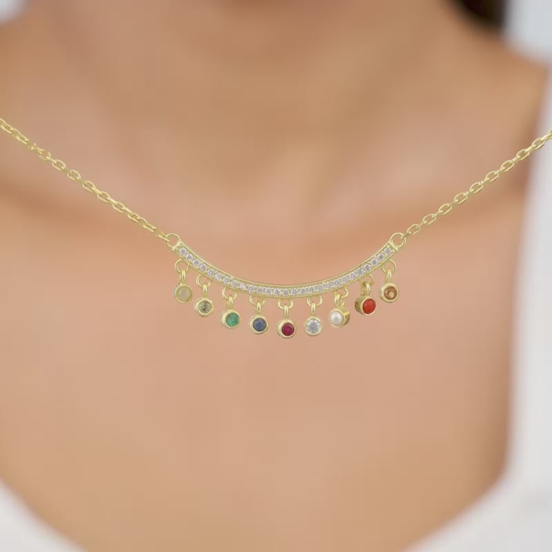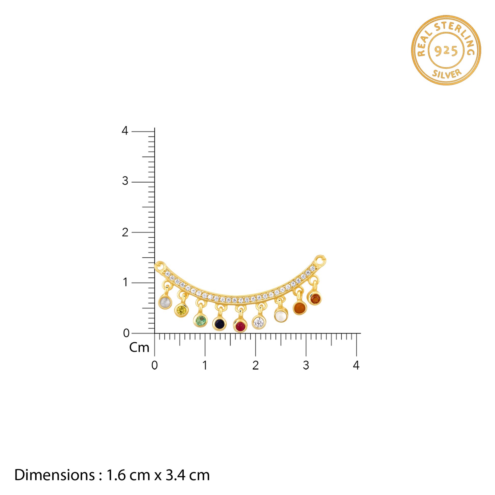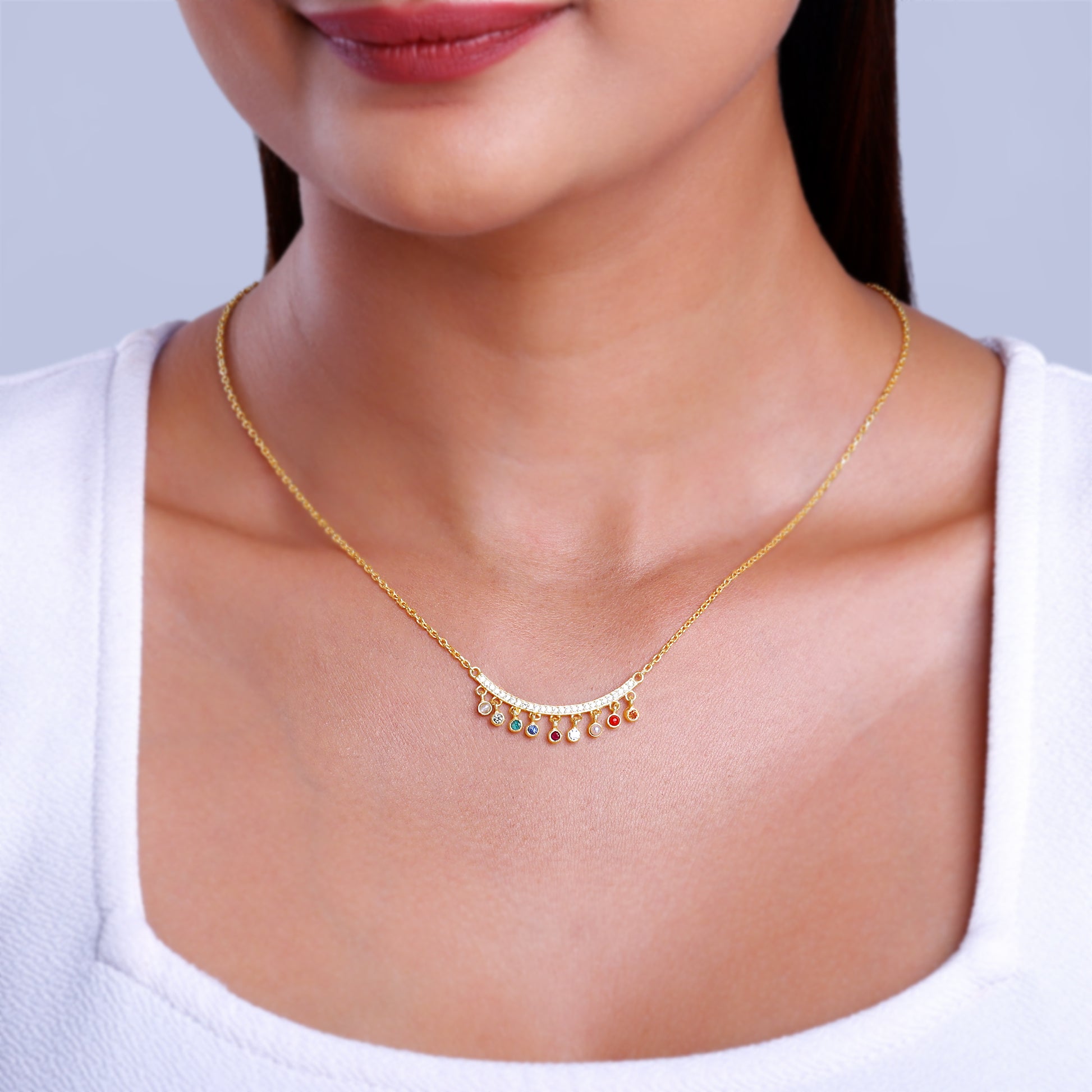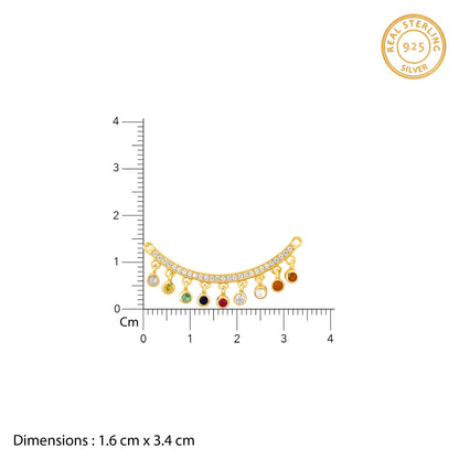 This elegant gold-plated pendant features a delicate arc and adorned zircons. Vibrant Navratna stones dangle from the arc, giving it a bubbly look.