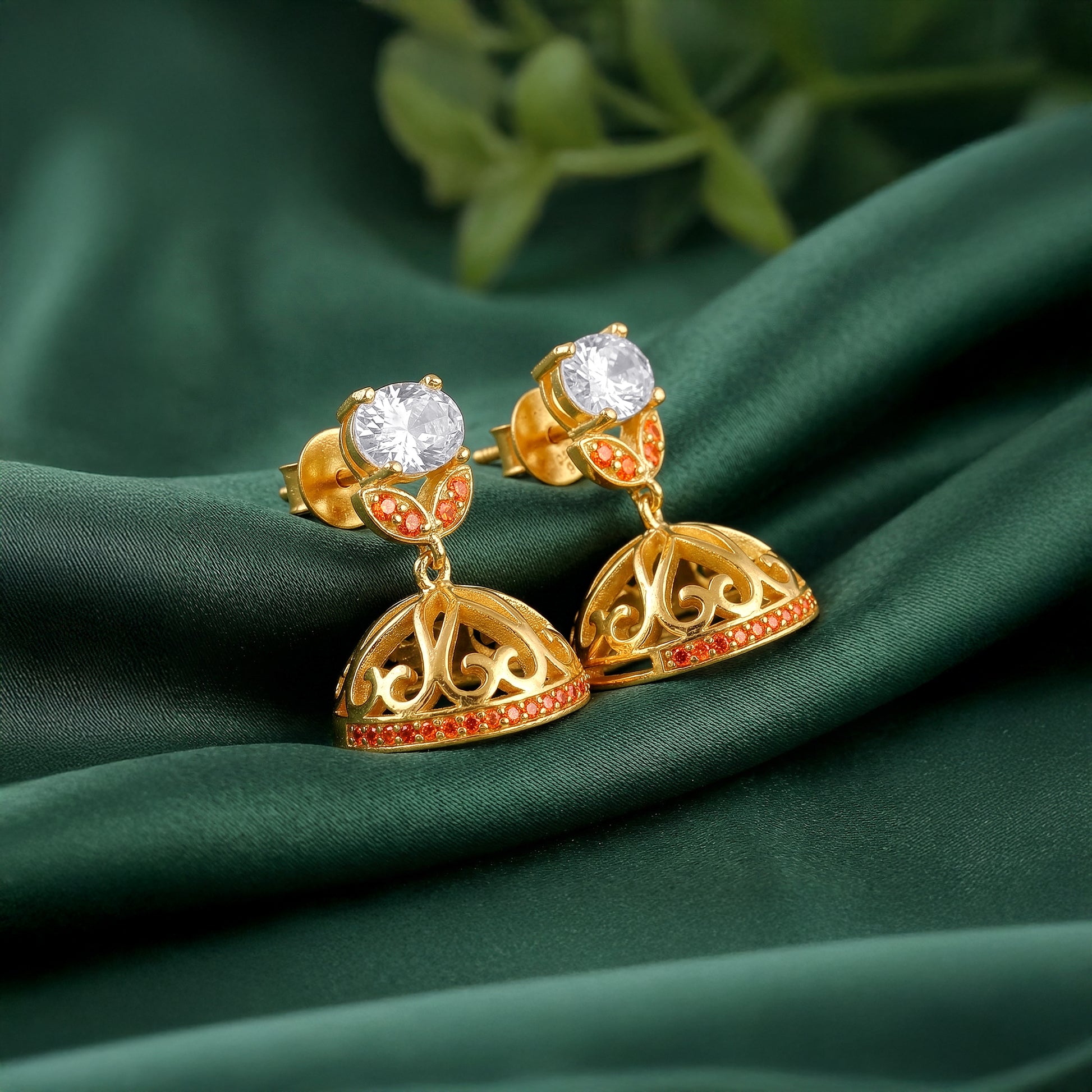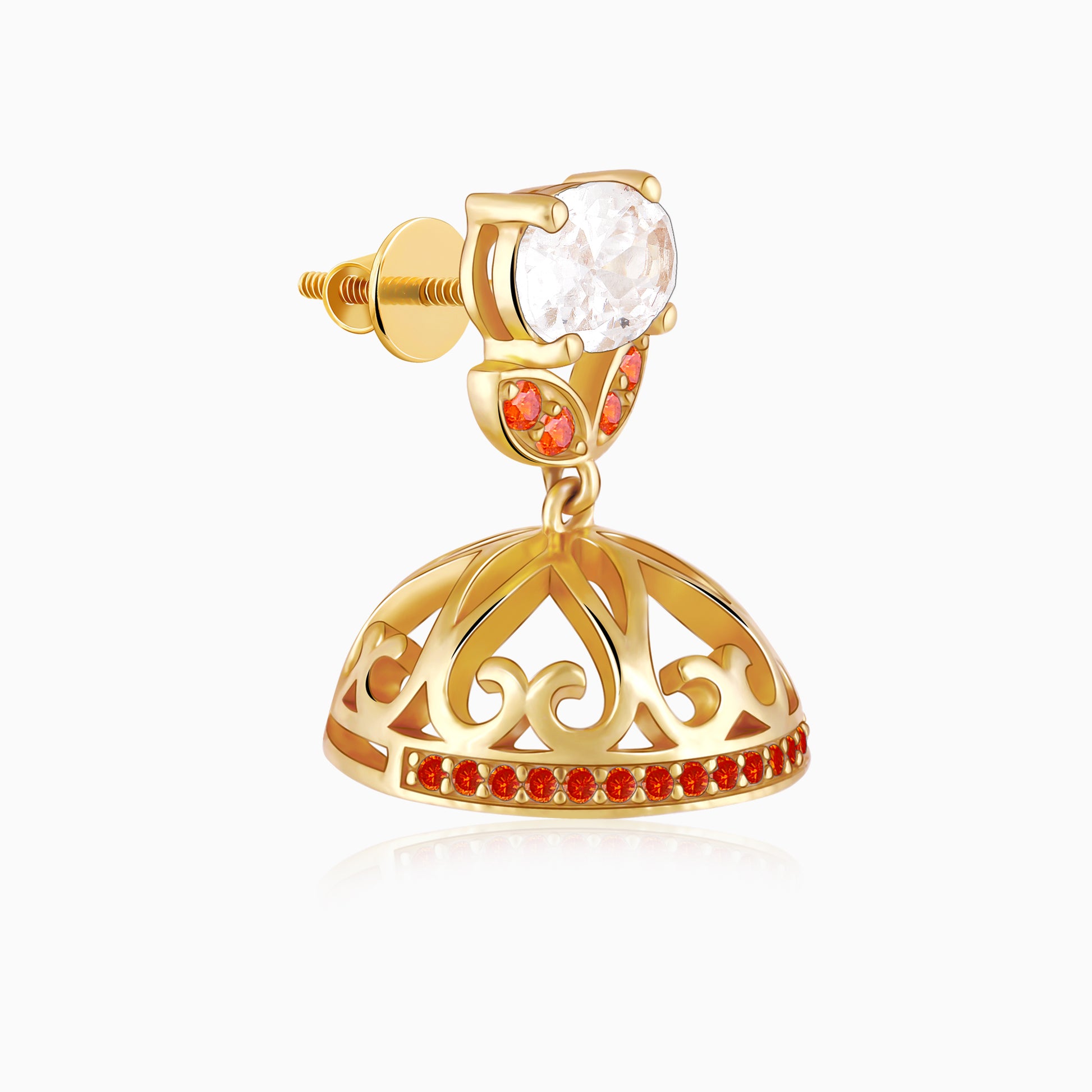 These gold plated earrings feature an oval-cut zircon at the centre, accented by a coloured stone floral base. The jhumka is intricately designed with delicate cut-out patterns and finished with a border of shimmering stones, so every movement becomes a moment worth noticing. Designed in Italy. Inspired by India. Embrace the goddess within with the Shakti Collection by GIVA x Anna Giulia Chicco.