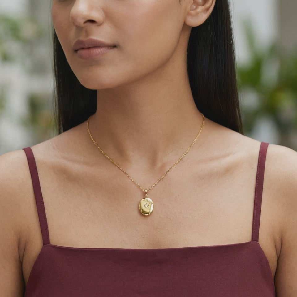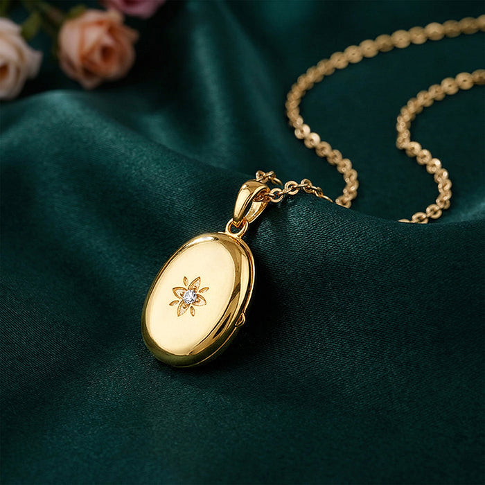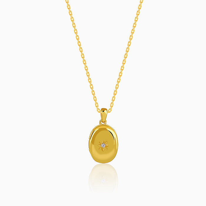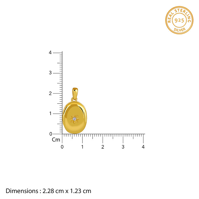 An elegant gold plated oval locket with a high-polish finish and an oval silhouette. At the centre, a starburst design set with a single zircon adds a vintage-inspired focal point, making it a timeless keepsake.