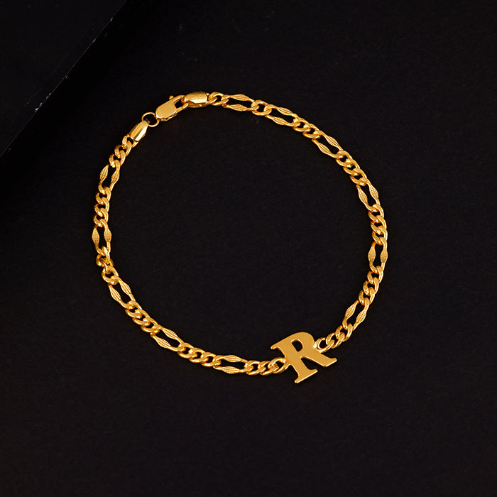 This gold plated mens bracelet features a classic figaro chain. A prominent, polished gold plated initial charm is securely integrated, creating a sophisticated and personalised mens bracelet. Its adjustable clasp ensures a perfect fit for everyday wear or gifting. It's a durable and stylish custom gold bracelet for him.