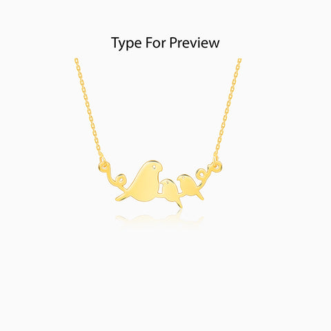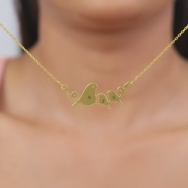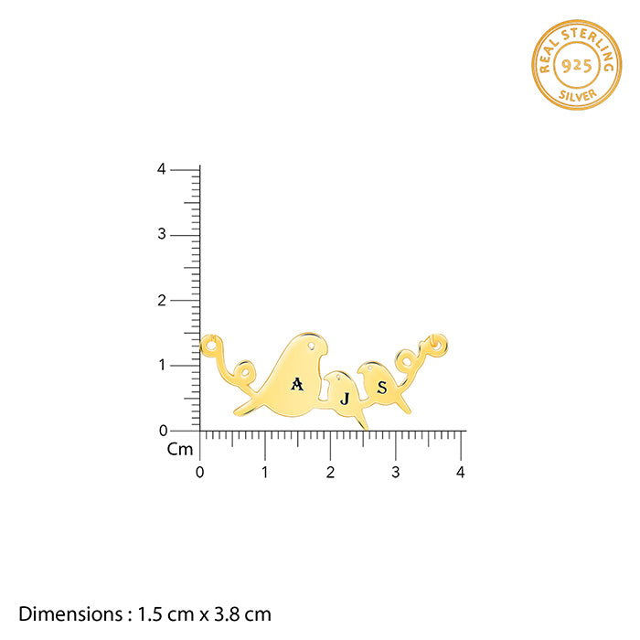 This golden personalised pendant for women features three bird motifs on a branch with initials of your choice engraved on each.
