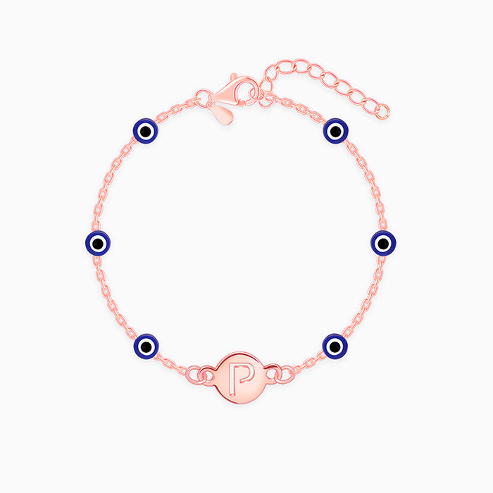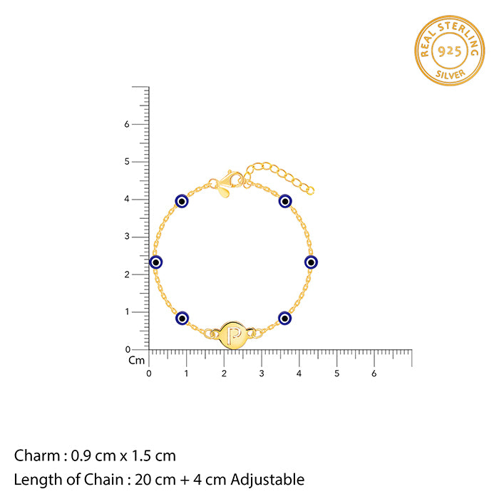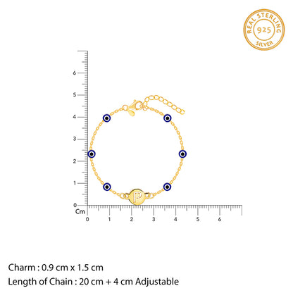 This gold plated personalised bracelet for women features a circular motif engraved with an initial of your choice. An evil eye motif is placed throughout the band.