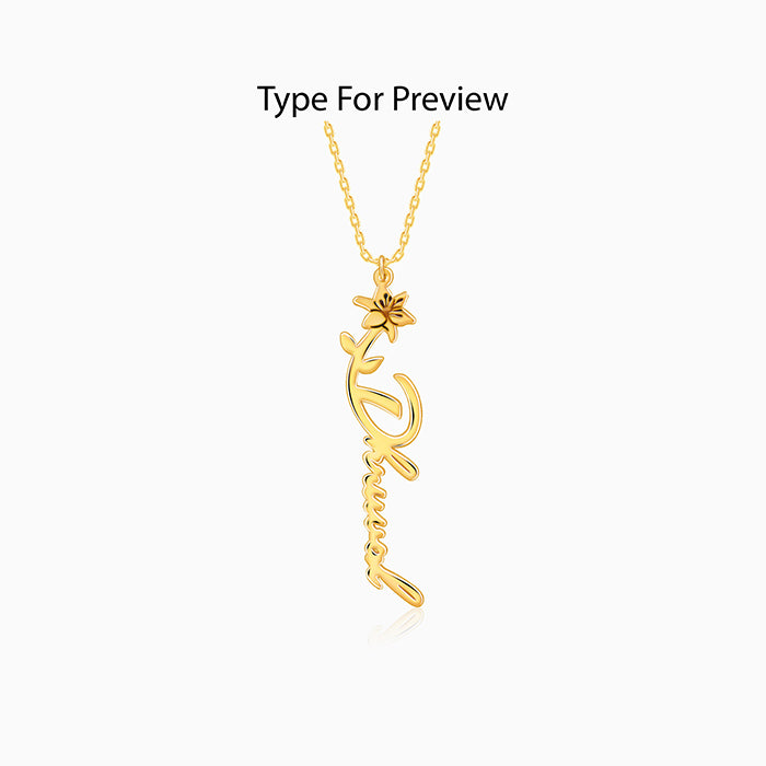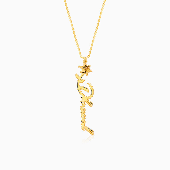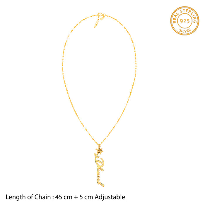 This gold plated customized name pendant with link chain for women features a vertical design with the name of your choice in an elegant, flowing script, accented by a stylised flower.