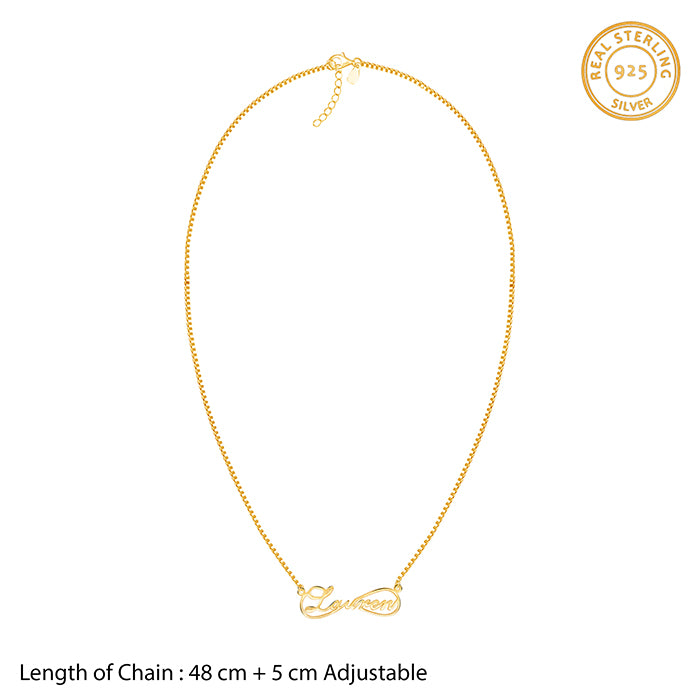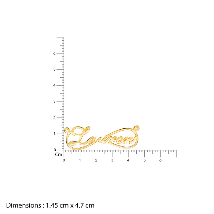 This gold pendant features a name enclosed within a half-infinity motif.