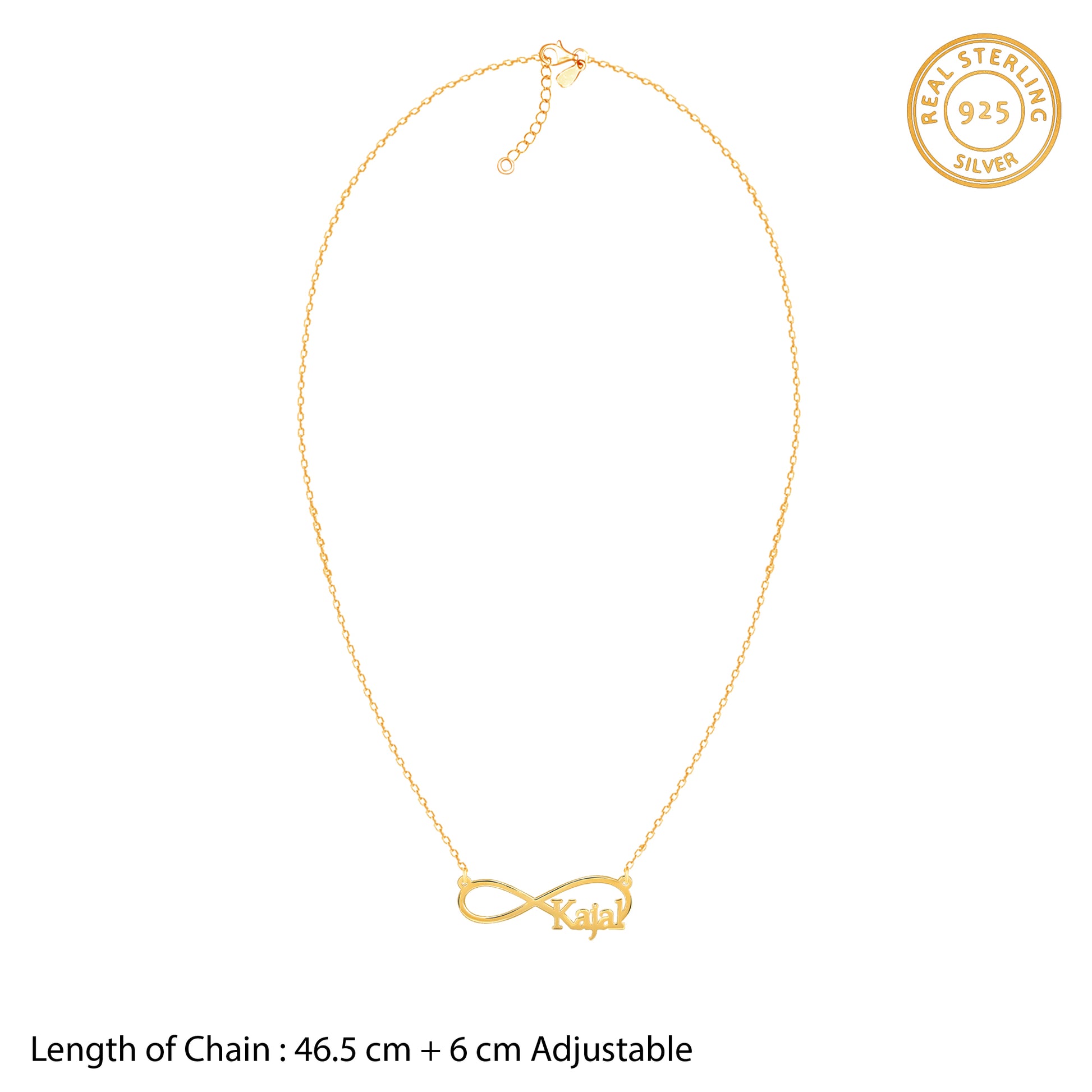 This personalised gold plated necklace for women features an infinity motif with a name of your choice sitting elegantly on one of the loops.