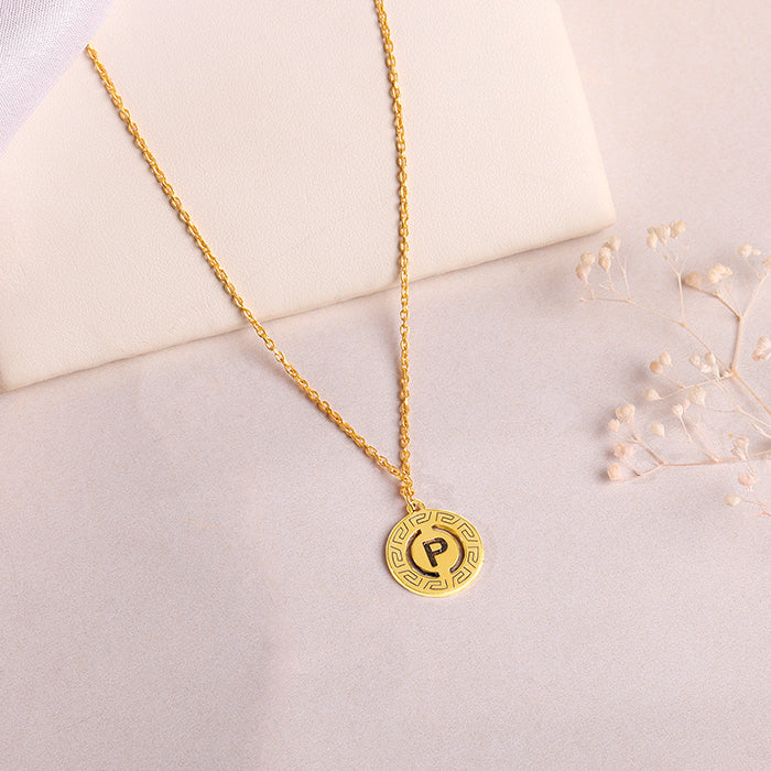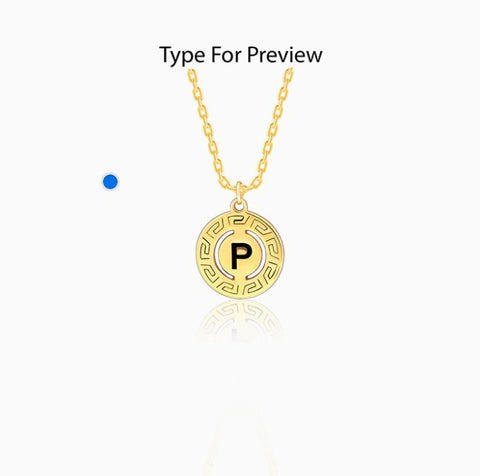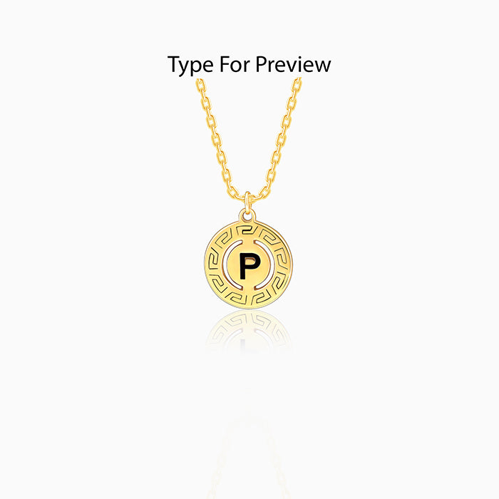 This gold plated personalised pendant with link chain for women features a circular disc with a greek key pattern border, engraved with an initial of your choice.