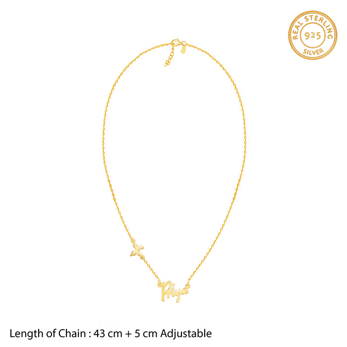 This personalised golden jewellery features a butterfly motif on one side of the chain and the name you choose to personalise as the pendant.