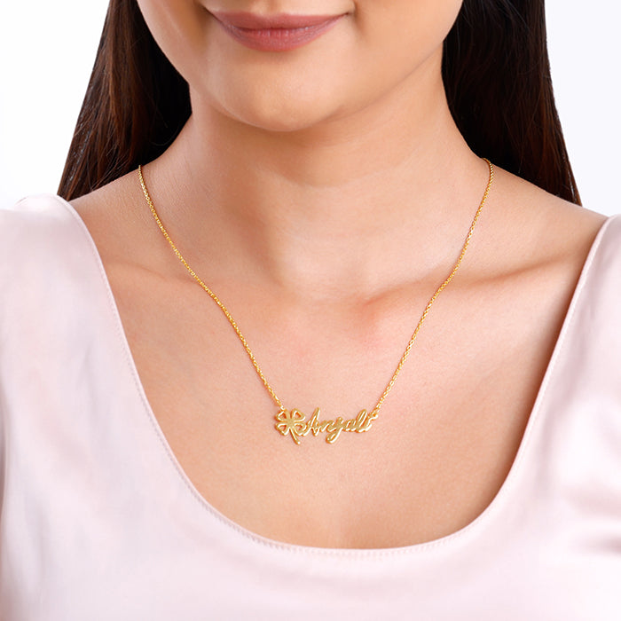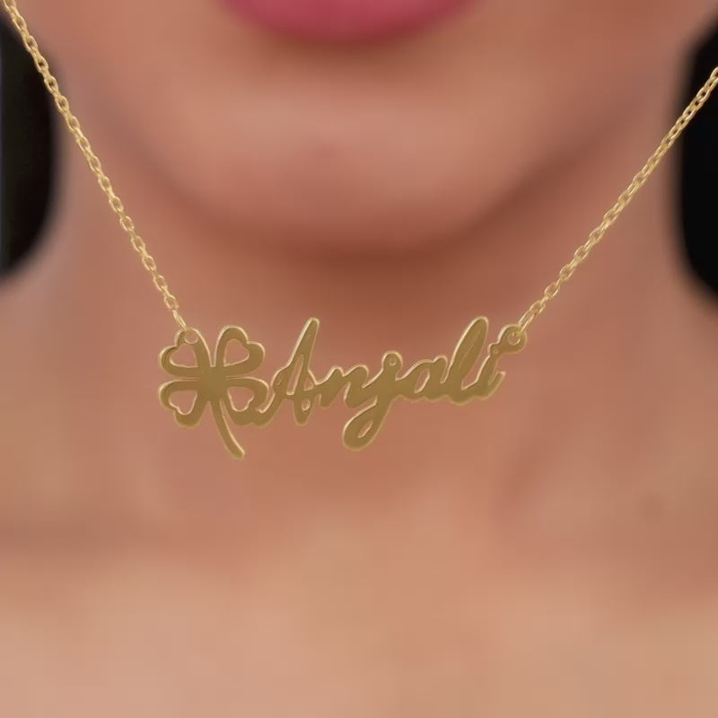 This gold plated custom name necklace features a dainty clover charm fused seamlessly with your chosen name—in this case, Anjali. The handwritten-style font adds a soft, feminine flair while the clover leaf adds a symbolic twist of positivity. It’s a modern mix of elegance and emotion.
