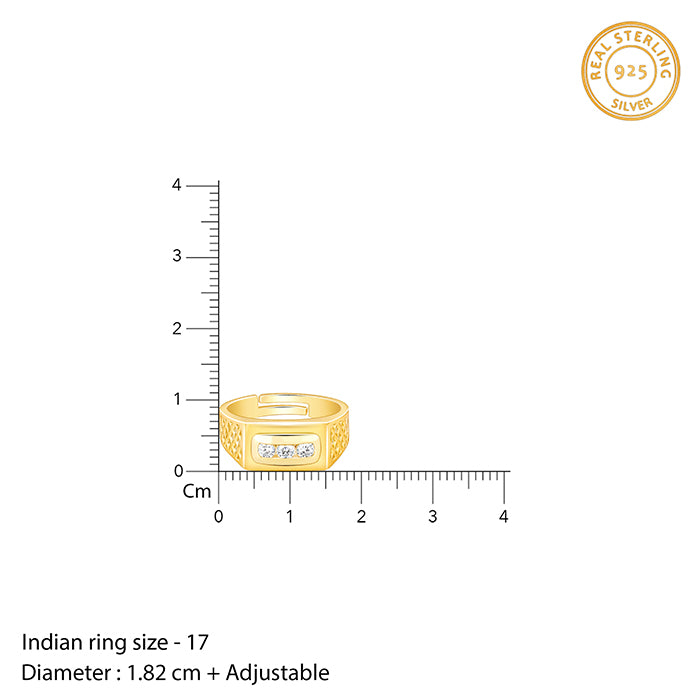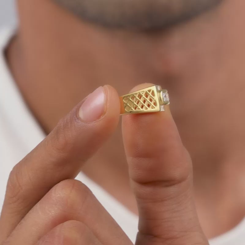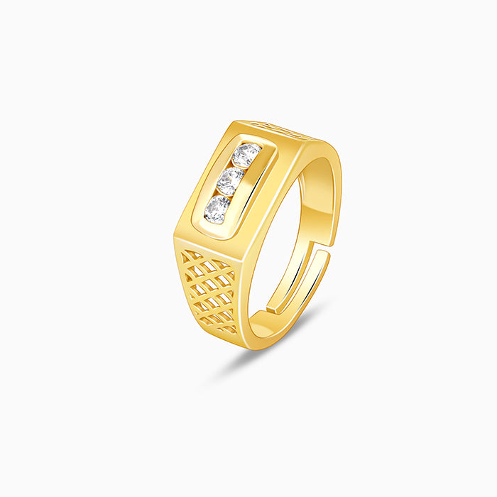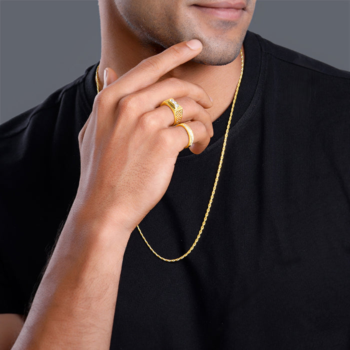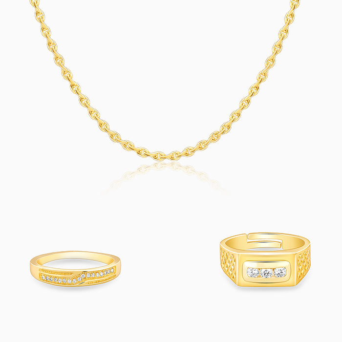 This golden set for men includes two rings and a chain. One ring features a wavy design accented with zircons at the front, while the other showcases an intricately patterned rectangular zircon motif at the centre, complemented by a studded band. The chain features a classic rope design, with each link closely woven for a refined finish.