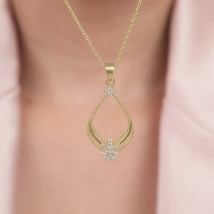 This pendant has an eye-catching elongated hoop with a cluster of zircons on the top and the bottom tip.