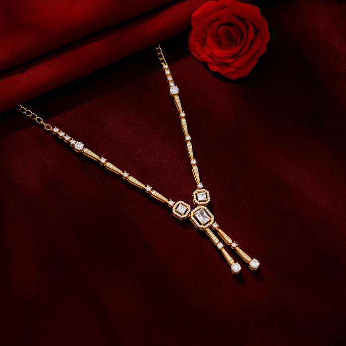 It’s that piece that behaves elegantly but still has a wild sparkle streak. This gold plated necklace for women features a slender lines of zircons leading to three square-cut larger zircon stones as the centrepiece, each framed in a small zircon halo, with two vertical strands cascading below.