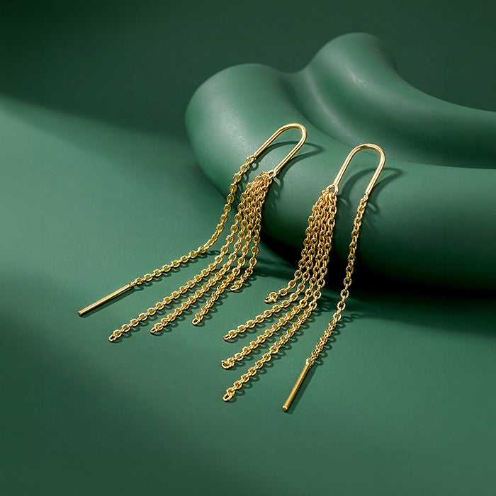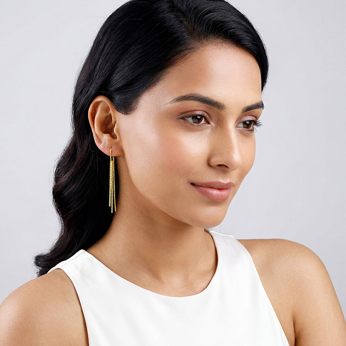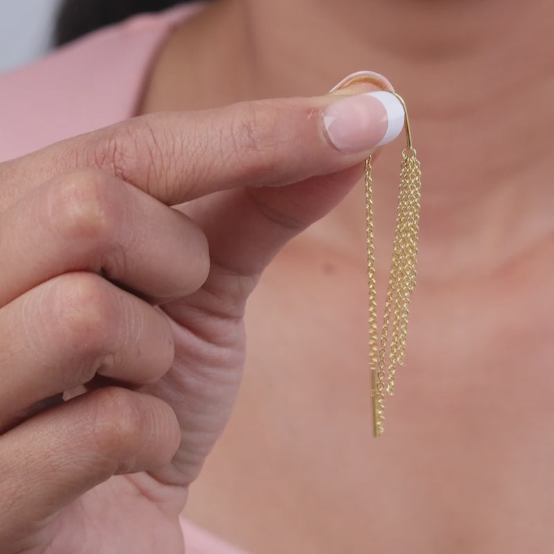 Made to own the night, these silver sui dhaga earrings with gold plating feature cascading chains that shimmer with every move. Fluid, bold and full of energy, they bring effortless party glamour with a warm dual-tone glow.