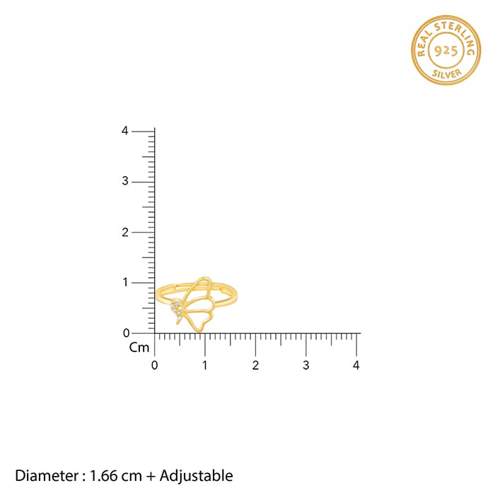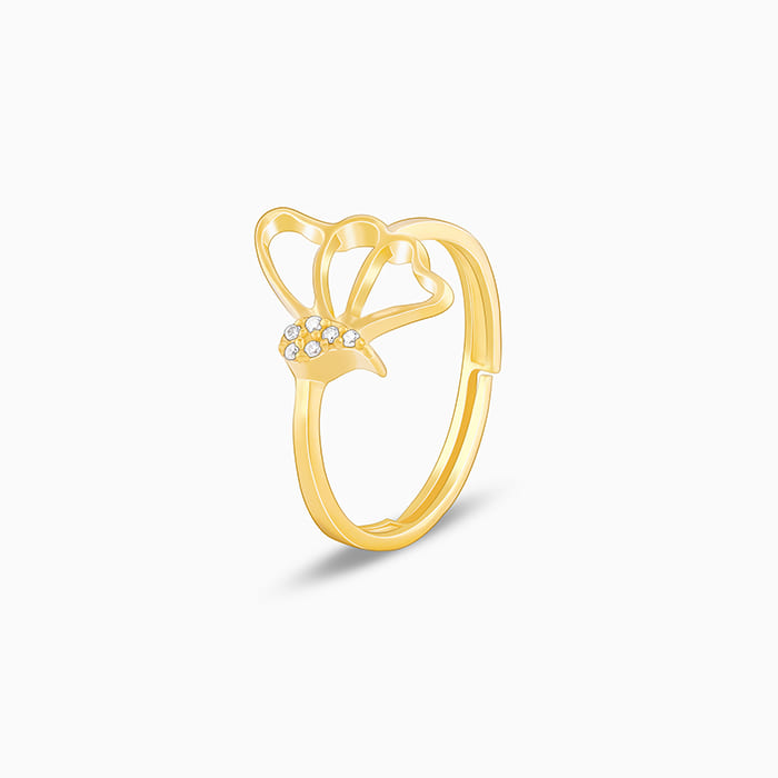 This golden ring features a butterfly motif in the side view with its body sporting zircons.