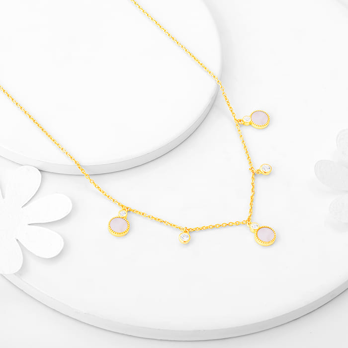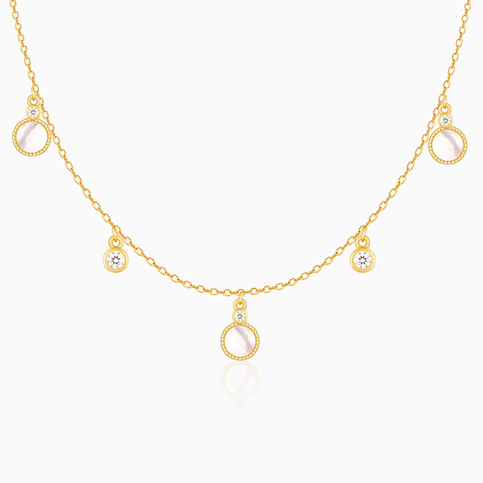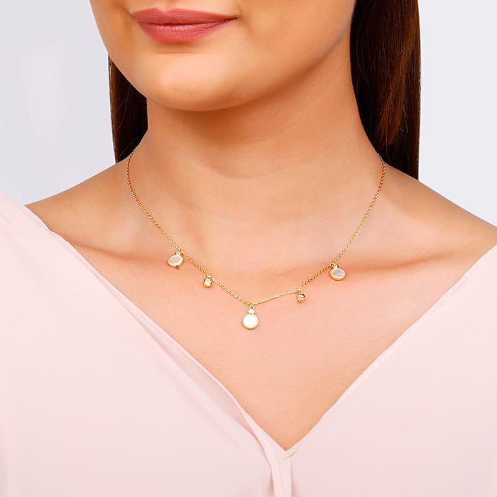The golden necklace has five white marble colour and zircon studded droplets