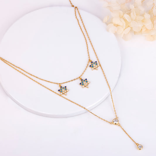 The golden necklace has two layers, where the first has star-studded with zircon and the second layer has drops