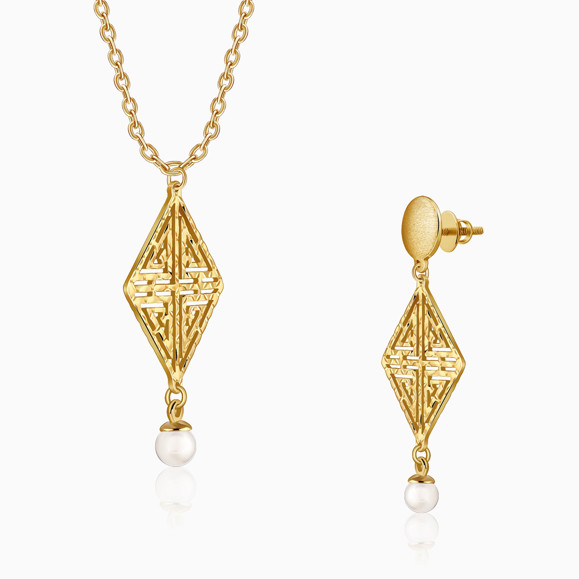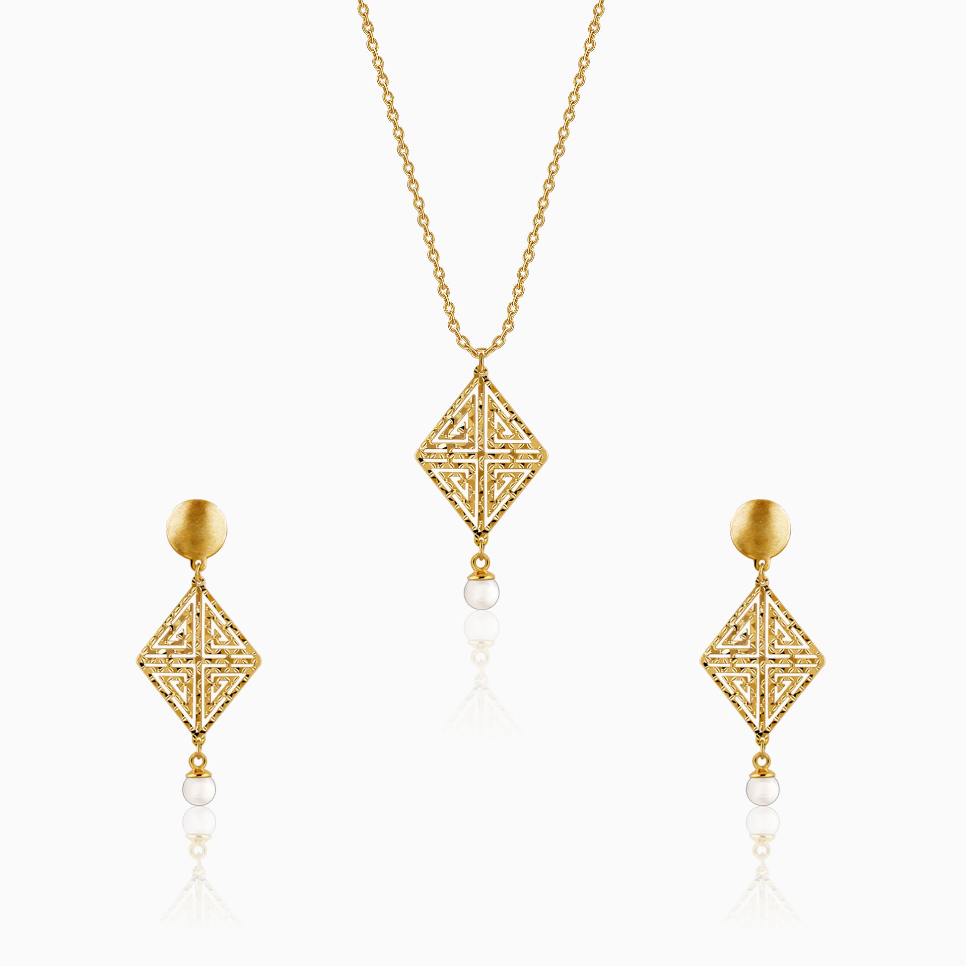 Celebrate an unbreakable bond with this radiant gold plated jewellery set for women, featuring a necklace and matching earrings. Its sophisticated lattice design and shimmering pearl drops evoke a romance that is both classic and enduring. Barkha Singh x GIVA brings to you the Glow in Motion collection that celebrates CNC craftsmanship for the first time in silver.