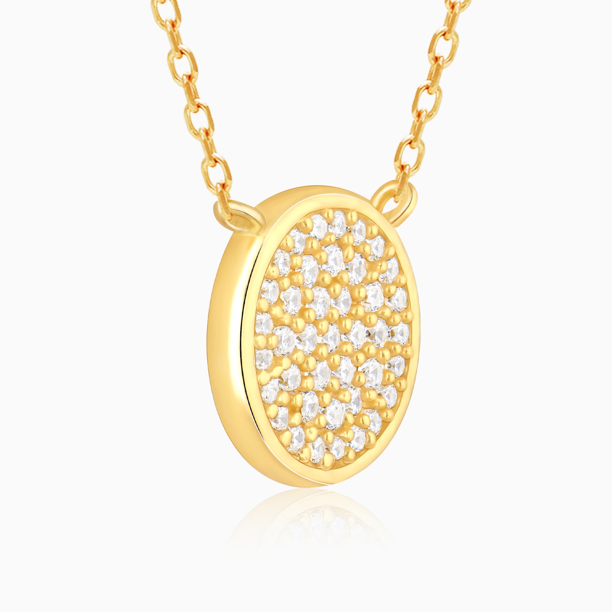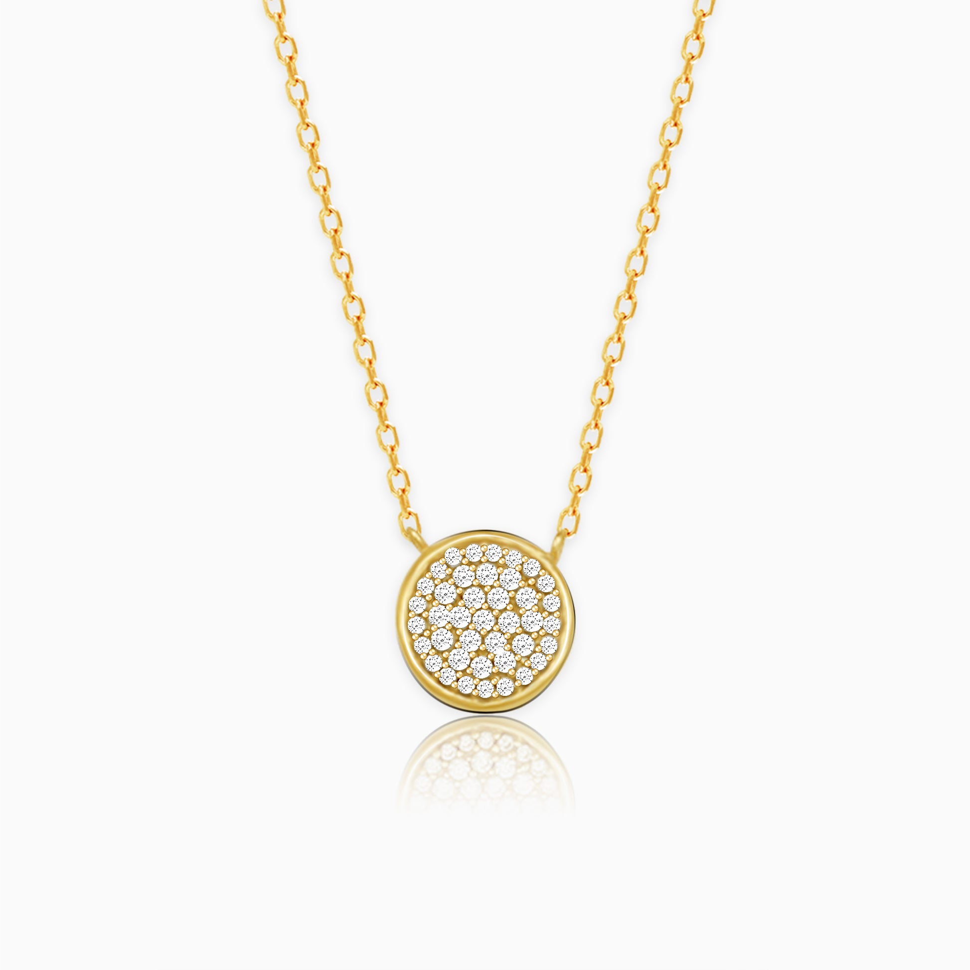 This Golden Studded Disc Necklace is handcrafted with love, just for YOU. This dainty necklace is studded with shiniest zircons out there along with the golden plating adding to the charm.