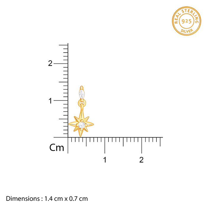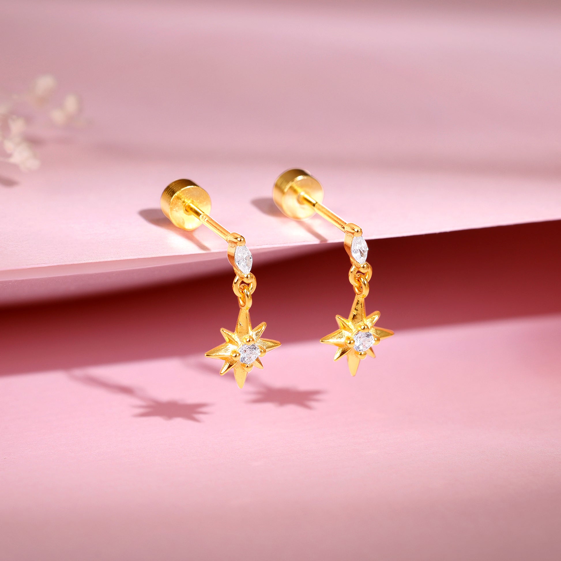 These gold plated ear piercings for girls feature a dangling minimal motif with sunray-like projections around a central zircon. Got multiple piercings? Get ready to curate your unique ear story! Mix, match, and express your personal style with our latest collection.