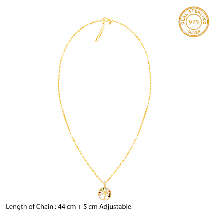 This pendant with a link chain is circular in shape and is gold-plated on silver. A motif branches out within the pendant adorned with colourful Navratna stones.