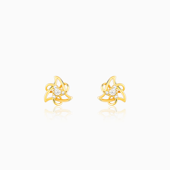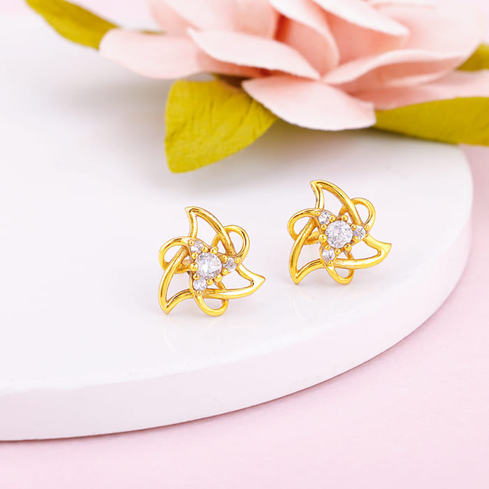 These golden earrings have an interconnected two-triangle motif nestling a zircon in the centre.