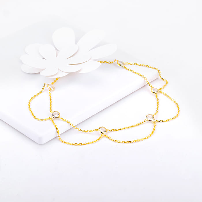 This golden anklet has two chains with studded zircons holding the outer chain to the inner one forming scallops.