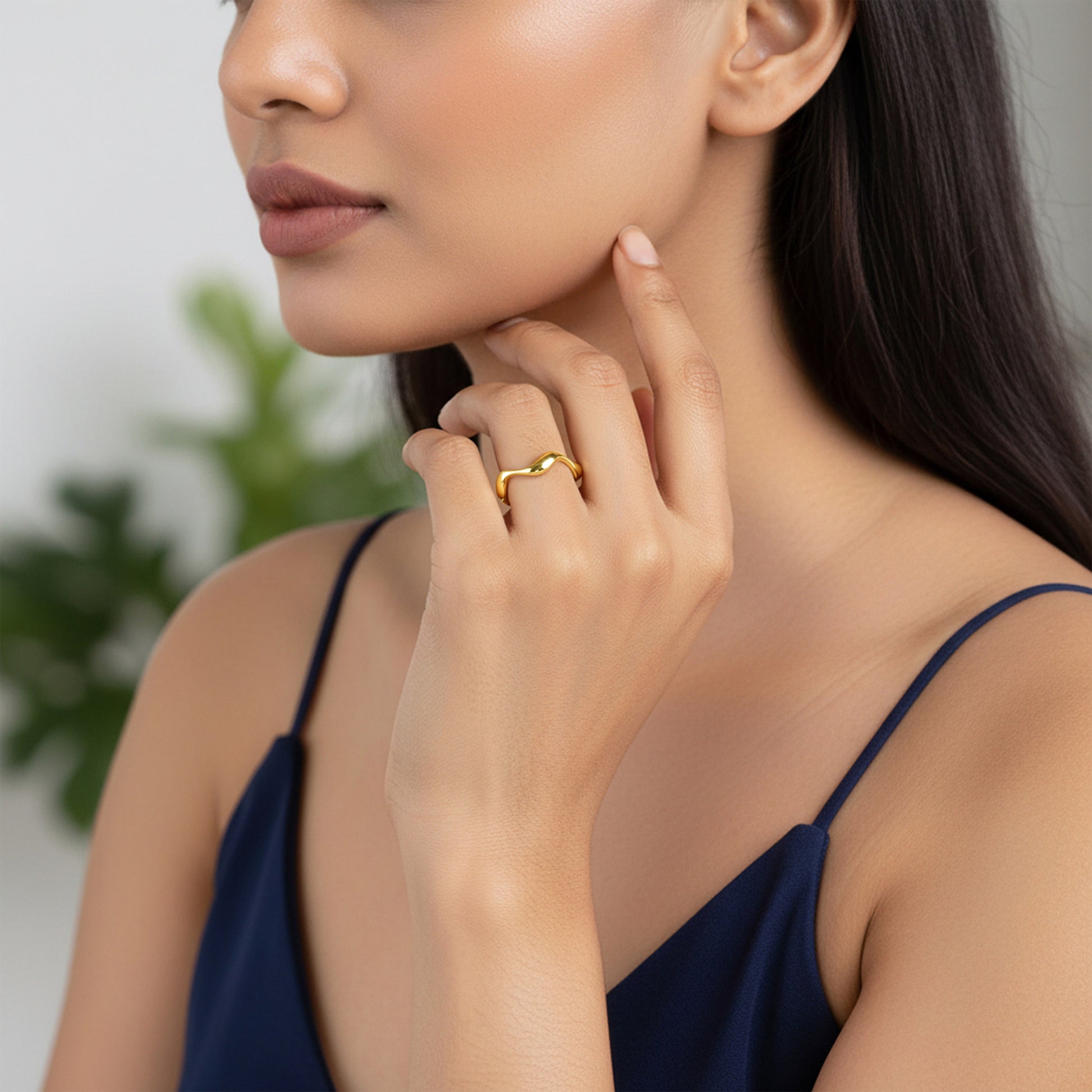 Fluid lines that move like light on water, wrapping your finger in effortless shine. This golden ring for women is all about quiet drama that catches eyes without trying too hard.