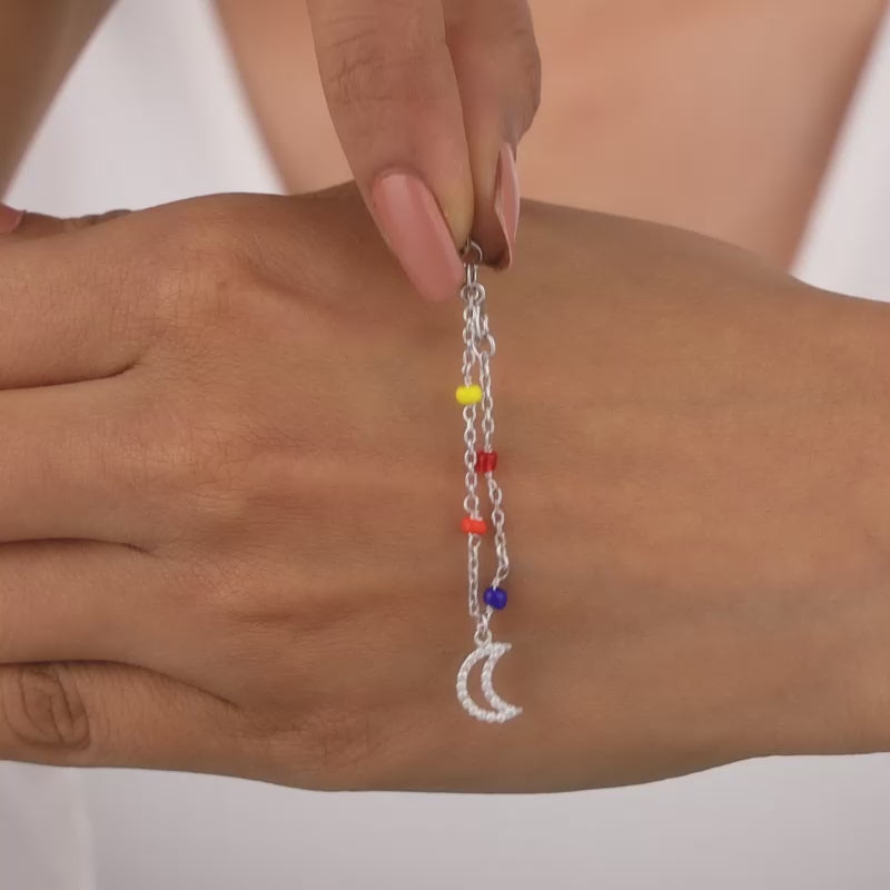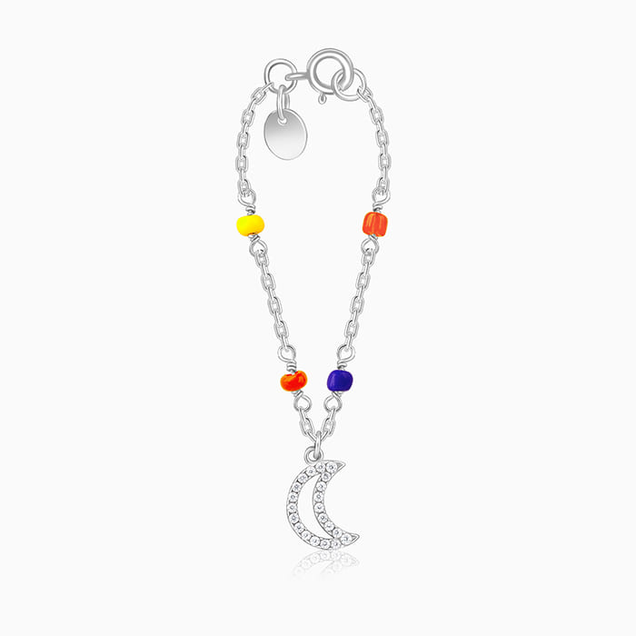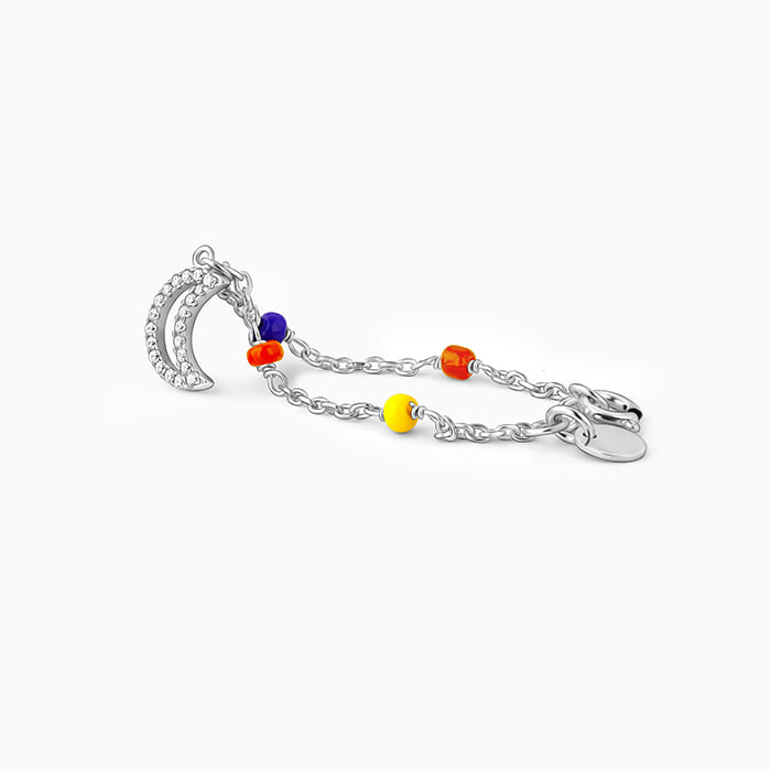 This silver watch charm features a half-moon motif with zircons and coloured stones.
